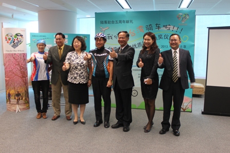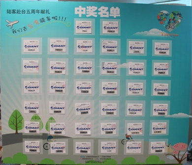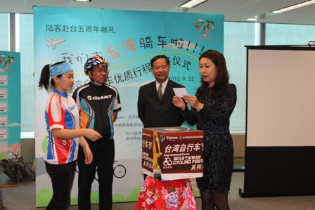 本处与北京捷安特公司合作举办之「我们去台湾骑车啦--自行车优质行程抽奖活动」,活动期间只要购买人民币3,000元以上的捷安特自行车就能参加抽奬,结果共有595位消费者获得抽奖资格,今天(9/23)在本处杨瑞宗主任及北京捷安特公司林清发董事长见证下,邀请台湾贸易中心首席代表吴政典、中华航空首席代表钟喜吉、中信旅游总经理季若荔及宝力豪体育健身公司总裁曹岩等贵宾抽奖,共抽出38位幸运得奖者(中奖率约为6.39%),将于11月10日赴台免费参加「台湾优质西线8日游」骑行日月潭的宝岛之旅。