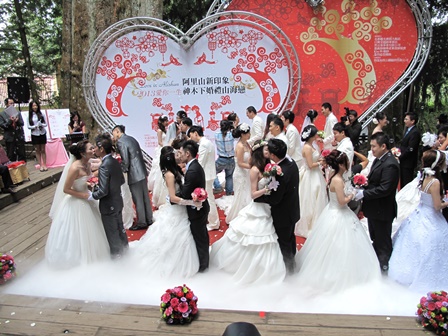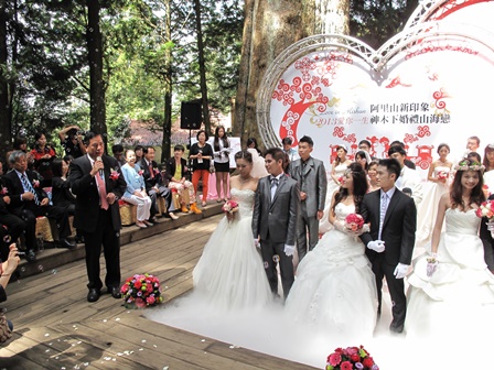 由阿里山风景区管理处主办的『2013阿里山新印象-神木下婚礼山海恋』活动,于10月2日在阿里山香林神木广场盛大登场。阿里山风景区管理处曾汉洲处长、嘉义县张花冠县长、林务局嘉义林区管理处廖一光处长、云嘉南风景区管理处郑荣峯处长、阿里山宾馆陈振兴总经理等嘉宾共同为今年参加的16对新人献上最深的祝福,这场全台湾最高海拔的国际浪漫神木下婚礼,有远从大陆及东南亚新人6对与台湾新人10对齐聚阿里山,在千年神木见证之下互许终身,完成终身大事,也为参与的来宾及游客们,提供了最神圣的福证。