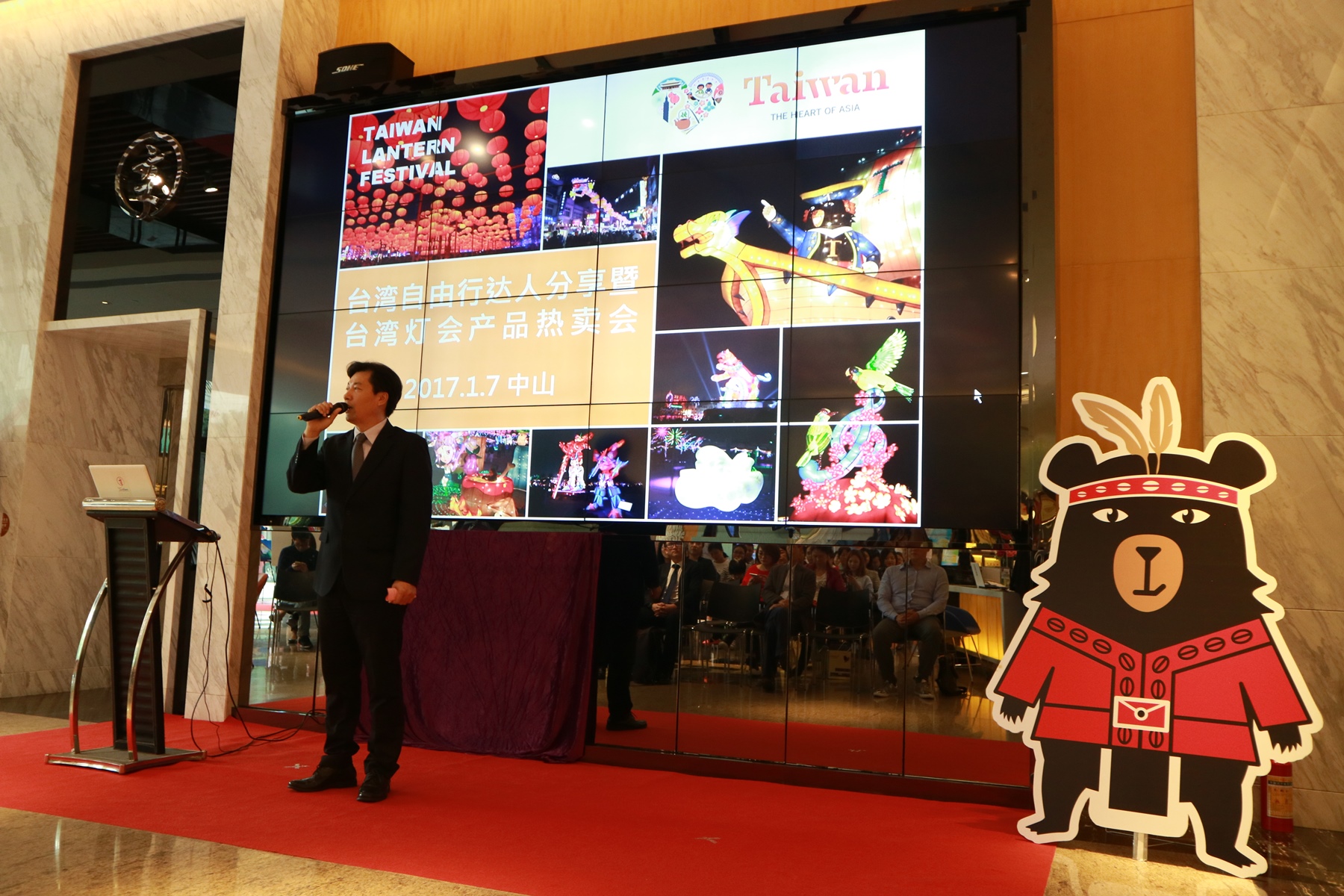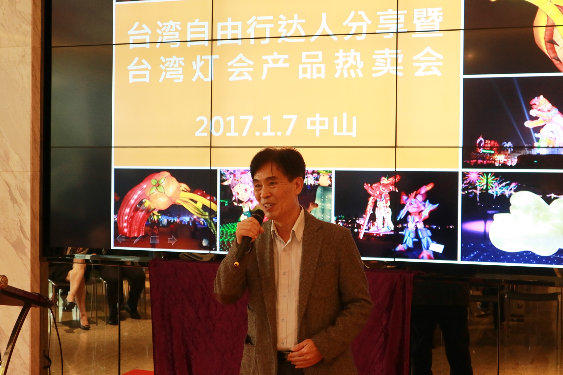 2017年1月7日,本处结合中山国旅举办「台湾自由行达人分享暨台湾灯会产品热卖会」,推出与「摄影达人」同游台湾灯会优质旅游产品。本处副主任江志端莅会致词,鼓励中山民众选择优质产品,参加2月11日至19日在云林举办的「2017台湾灯会」,并强调台旅会推动旅游首重「安全」与「品质」,有关方面已拟定6大措施及执行各项精进作法,以保障旅游安全,台湾民众友善、好客,一如往昔,旅游台湾,依旧值得您的信赖。