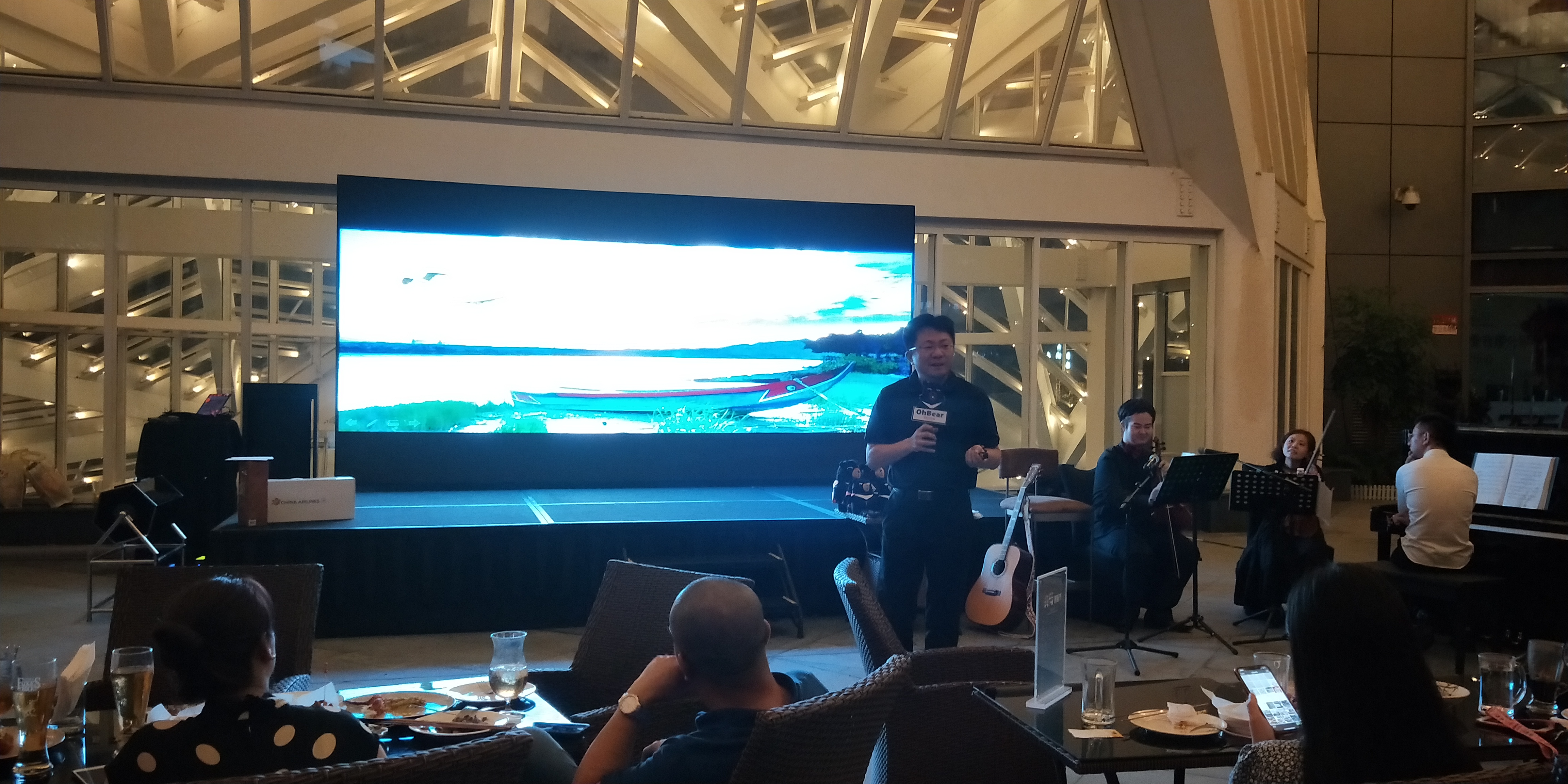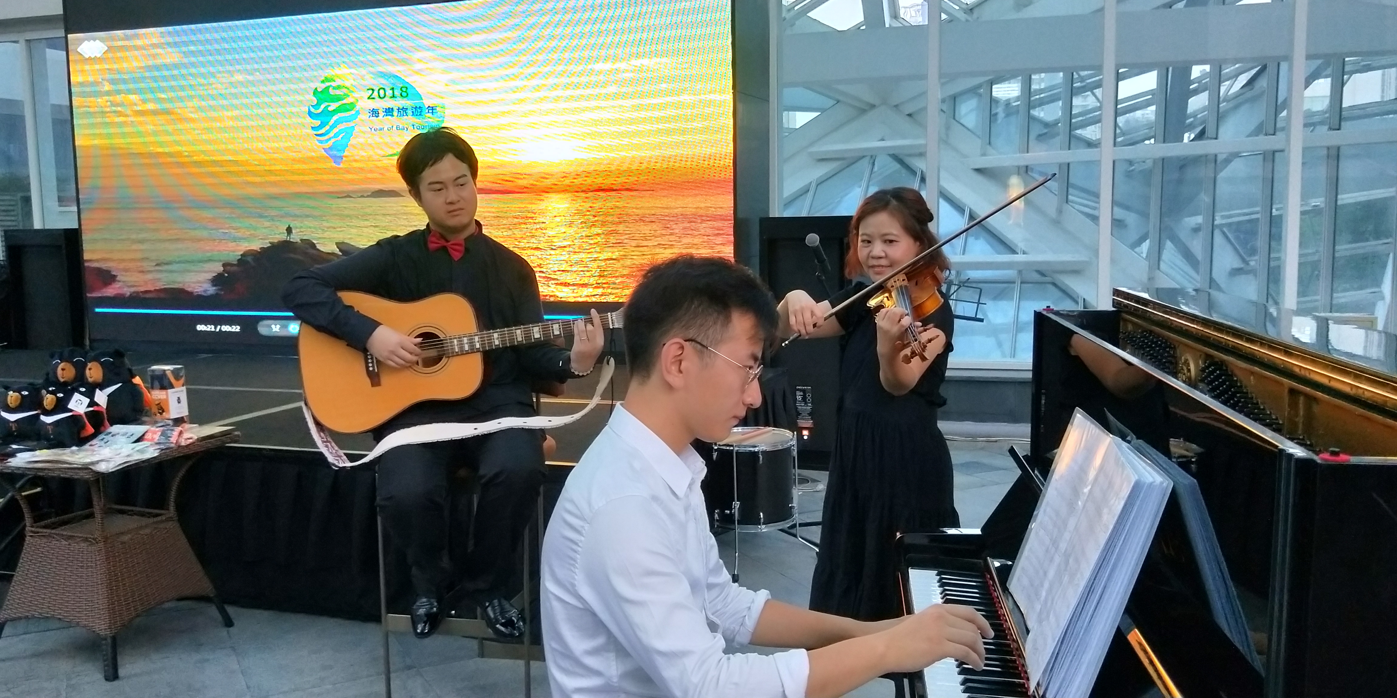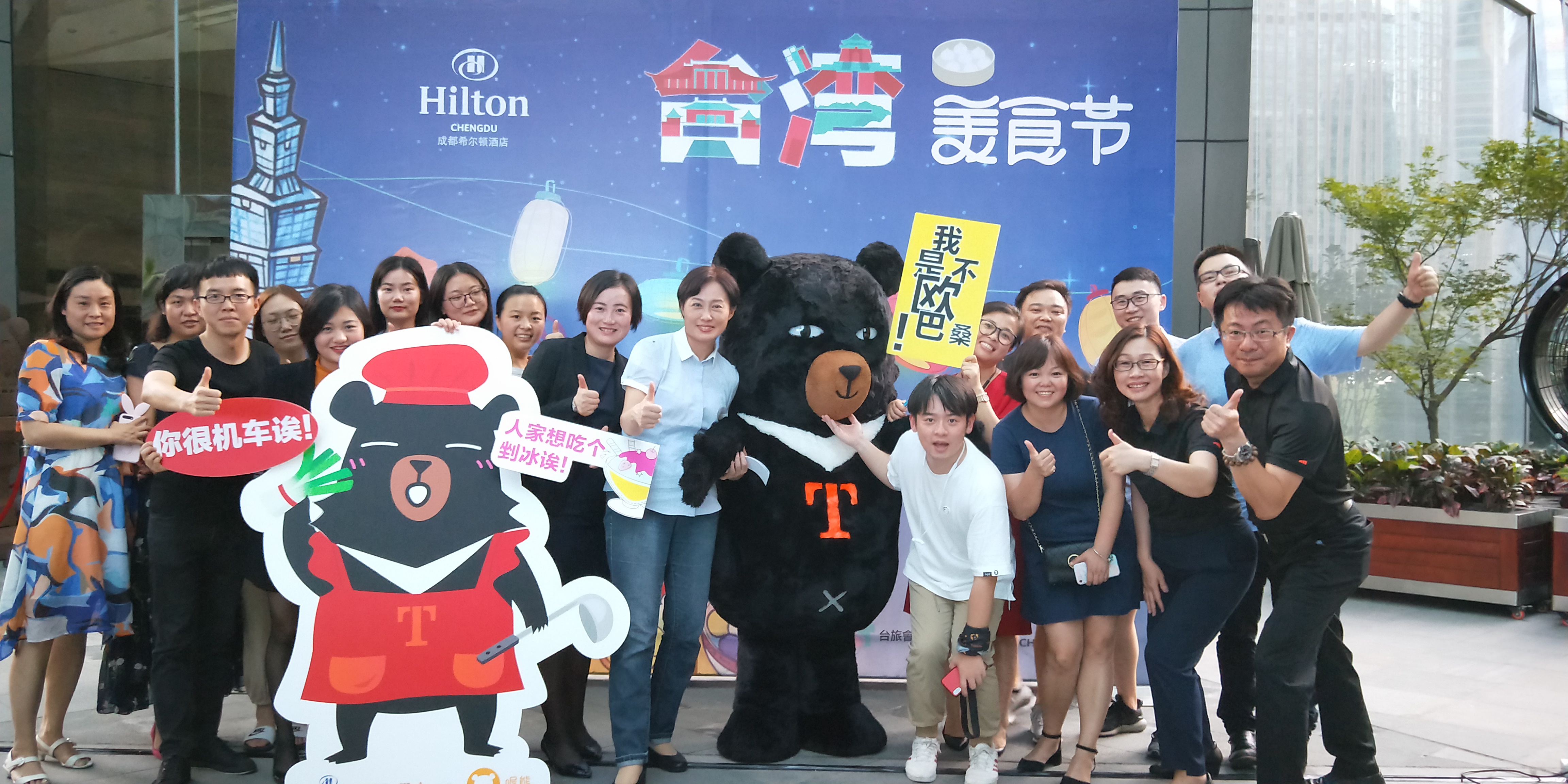 2018年8月31日及9月1日,本处假成都希尔顿酒店举办“跟着音乐游台湾”活动,台湾最萌观光代言人-喔熊组长也特地空运到现场。本处黄桂珠副主任感谢希尔顿酒店举办“台湾美食节”及华航共同参与本次活动,也邀请现场热情的来宾到台湾走走看看。两天晚上7点至9点,在酒店3楼户外广场由专业音乐家用小提琴与钢琴演奏最经典的台湾民谣和流行歌曲,并由策划本次活动的林蔚组长随着歌曲演奏,用最吸睛的风光照片推荐台湾分区游及深度旅行,吸引成都居民实地到台湾去感受歌曲背景故事与当地风土民俗。