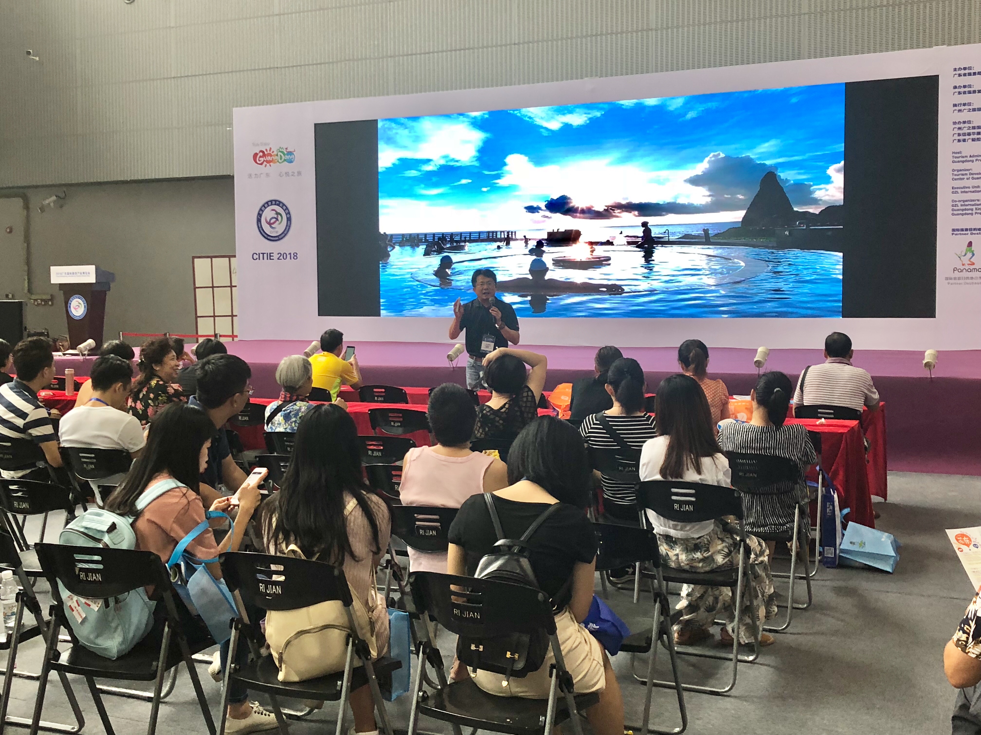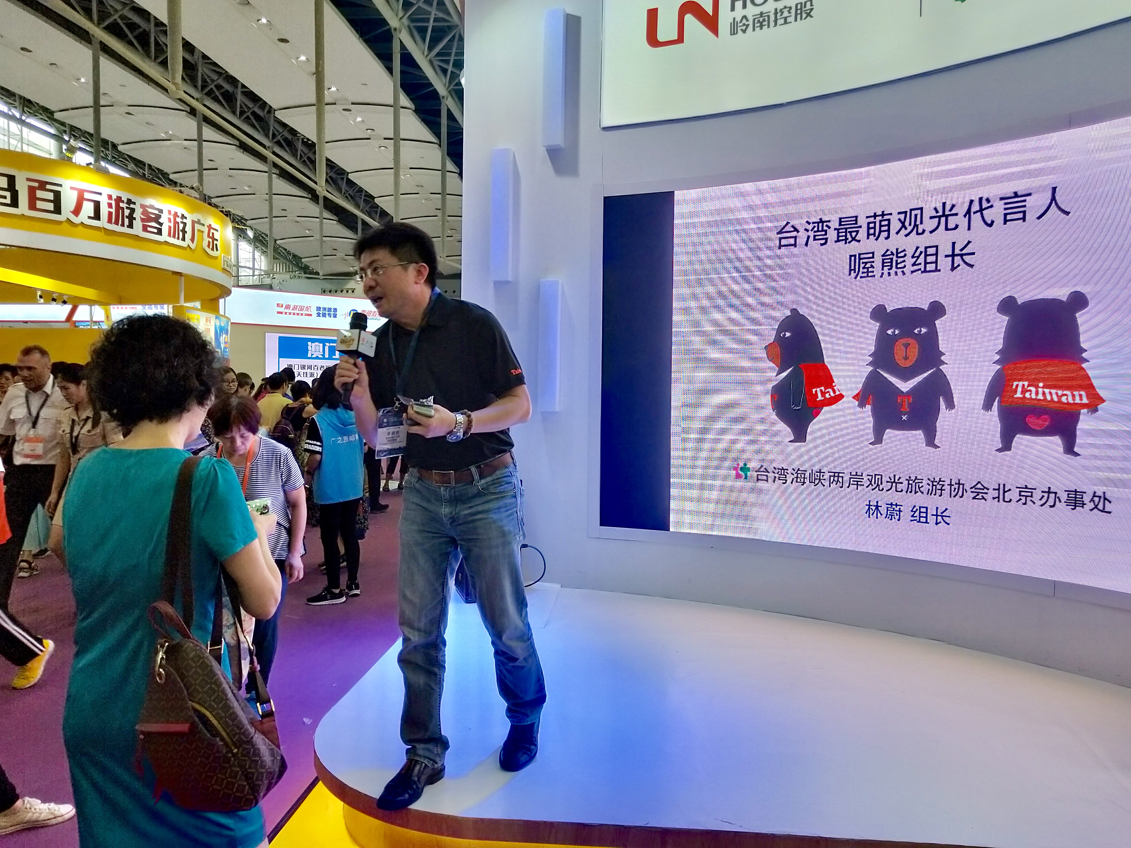 广州广之旅国际旅行社2018年9月7日至9月9日参加「2018年广东国际旅游产业博览会」,设摊销售台湾团体及自由行旅游产品,并邀请本处派员共同推广台湾旅游。本处组长林蔚特地携带喔熊相关创意文宣品,分别在展场公众区大舞台及广之旅的展摊舞台营销台湾旅游魅力,并接受广州广播电视台采访,加大台湾自由行宣传力度,藉以吸引广州旅客赴台旅游。(台旅会北京办事处发布信息)