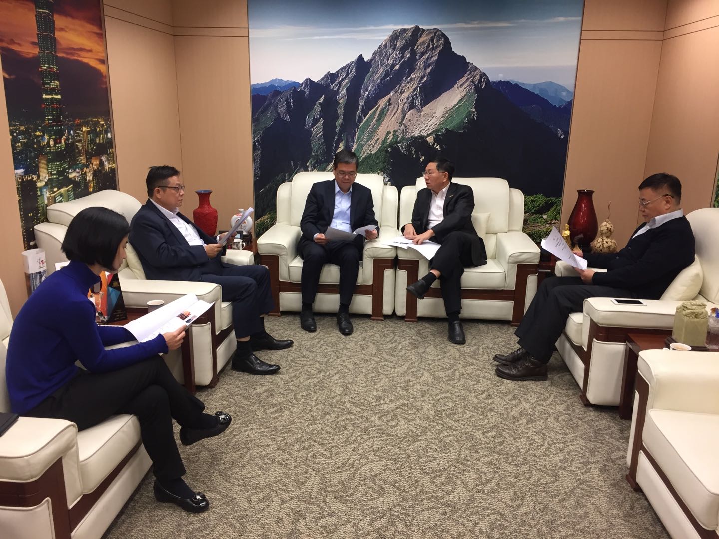 2018年11月22日台湾元富证券股份有限公司副总经理张清发、副总经理黄建胜、协理陈秀华及元富创投公司总经理朱忠源,与本处杨主任就两岸交流概况交换意见。(台旅会北京办事处发布讯息)