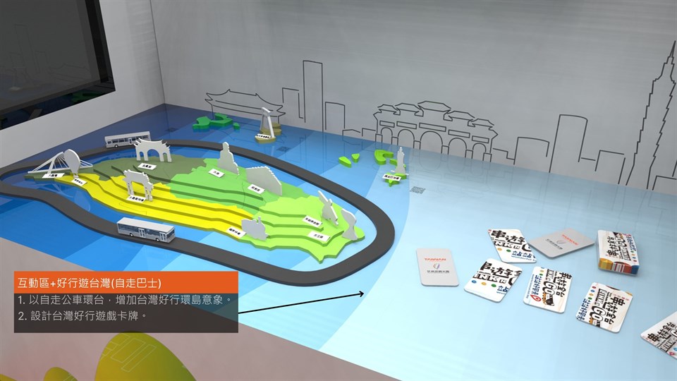 有别于「台湾好行移动博物馆」1.0版以车体外光雕秀为主题,本次强化车内互动五感体验,全面升级打造「台湾好行移动博物馆」2.0版。展览内容于静态展示新增北、中、南、东「区域路线主题特展」,互动部分特别加入「台湾好行」动态窗景、轨道车、游戏牌卡等游戏元素,及代言人喔熊大军立体模型等。透过各种布展巧思,让民众在展览中就能体验跟着「台湾好行」去旅行的美好感受。