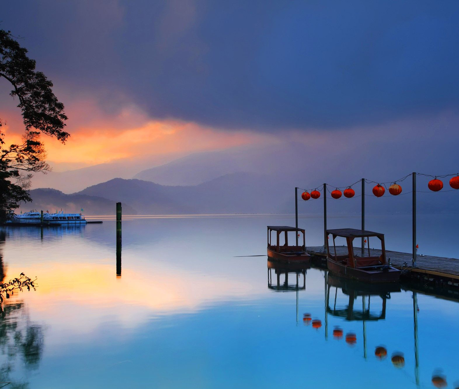 日月潭位于台湾南投县鱼池乡,是一座美丽的高山湖泊。潭面以拉鲁岛为界,东侧形如「日」,西侧形如「月」,故名日月潭。其周围山重水复,林木苍郁,潭面广阔水平如镜,映照群山变化万千。