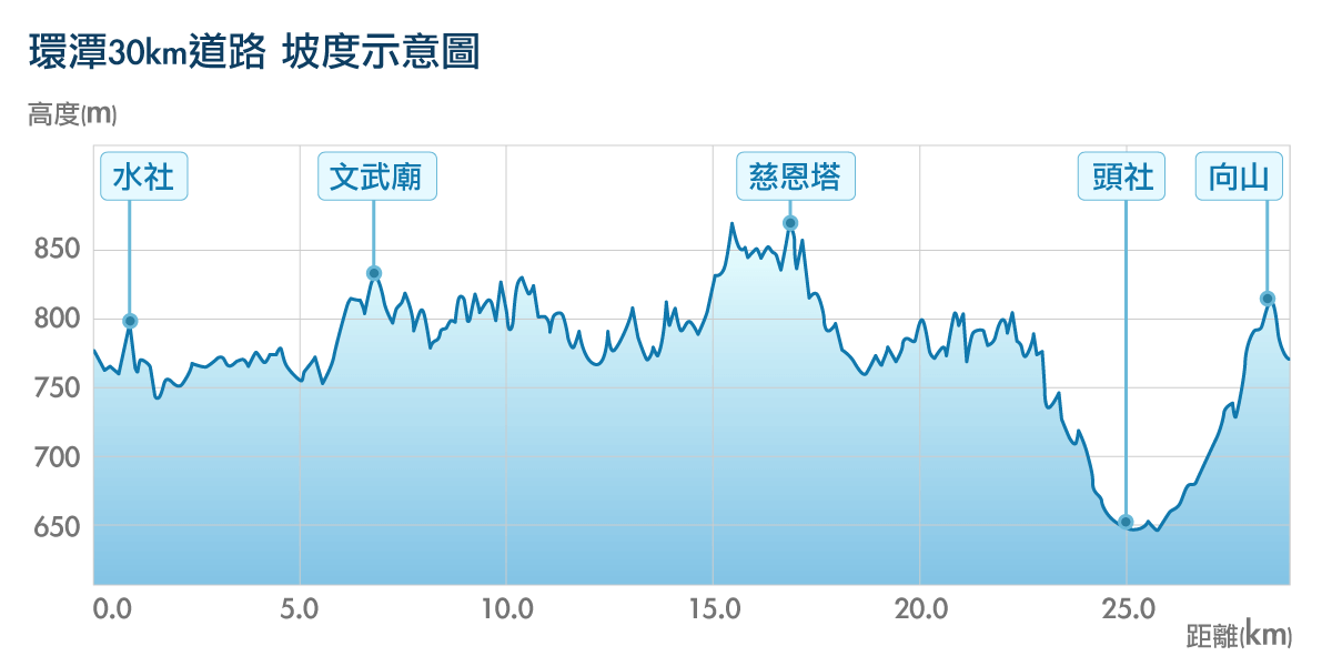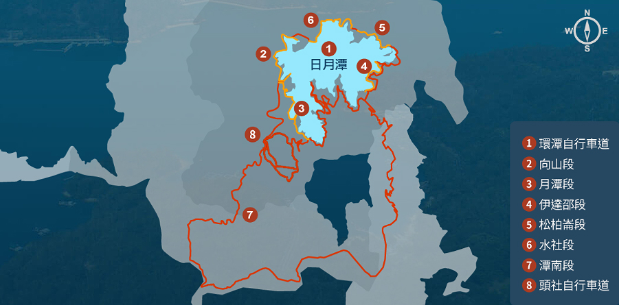 环潭公路骑乘一圈约为30 公里,沿途行经四大庙(龙凤宫、文武庙、玄奘寺、玄光寺)、松柏仑、大竹湖、水蛙头、土亭仔、青龙山等景点,湖光山色的迷人景致,有着丰富的原住民文化及自然生态,路线随着地势起伏稍有些挑战性,十分适合喜爱骑车赏景的车友们一起用双轮探索最美丽的日月潭!