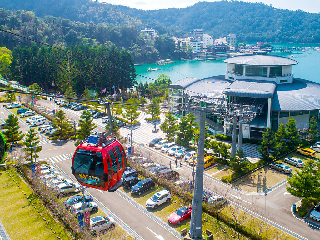 想高空俯瞰日月潭,欣赏日月潭高空之美,可选择搭乘日月潭缆车,起讫点位于九族文化村及日月潭缆车站两端点,全长约1,877公尺,单程约7分钟。