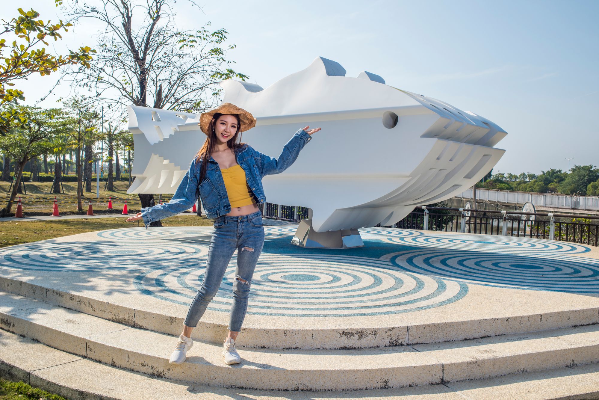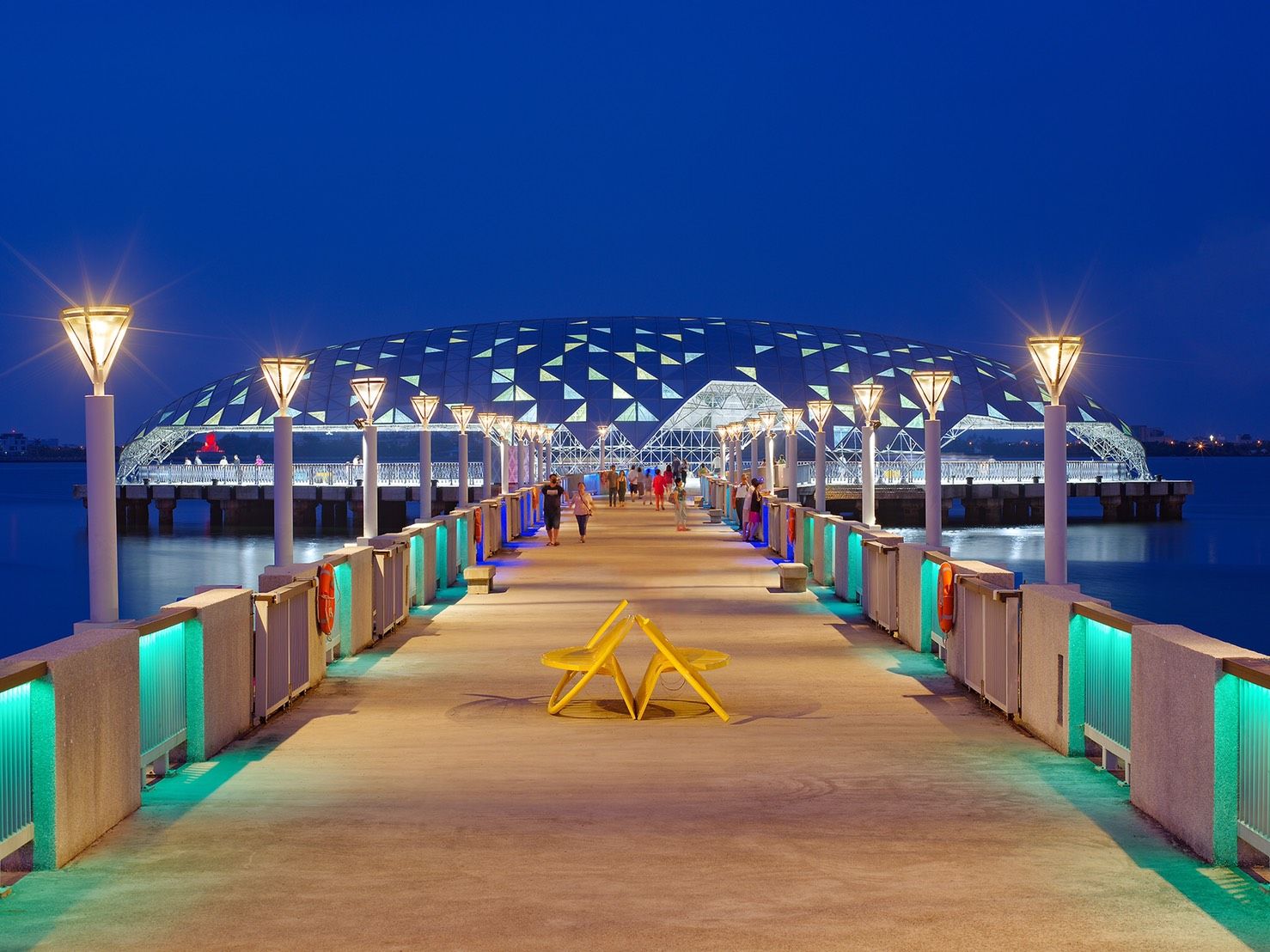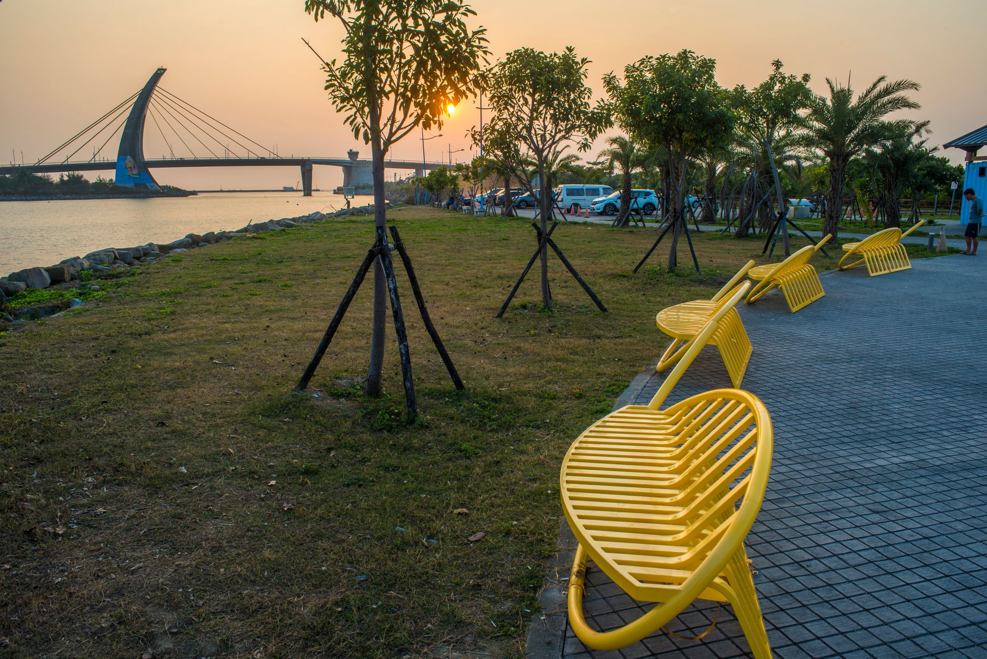 黄色鱼形座椅,恣意徜游在岸边广场上。白天中有日落之时,远眺大鹏湾的夕阳,缓缓沉降海平面,是将整个白天画上句号的最好落笔。