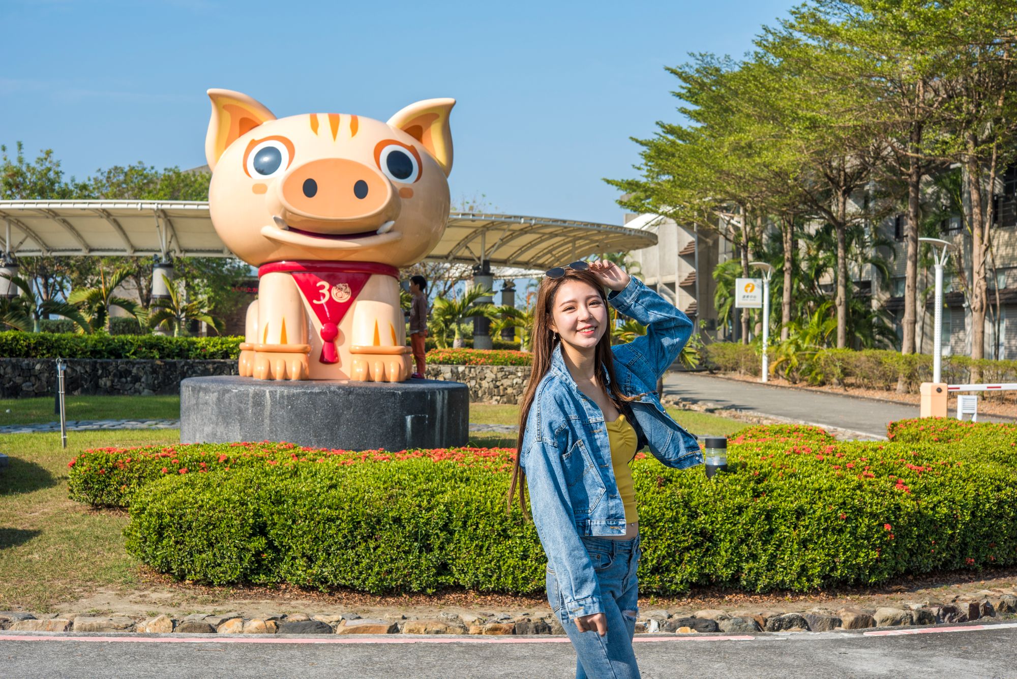 2019台湾灯会在屏东,「丰猪爷」创新副灯,灯会结束后,依然睁着炯然的大眼,带着獠牙却亲切的笑容,迎来送往贵宾旅客守护民众。
