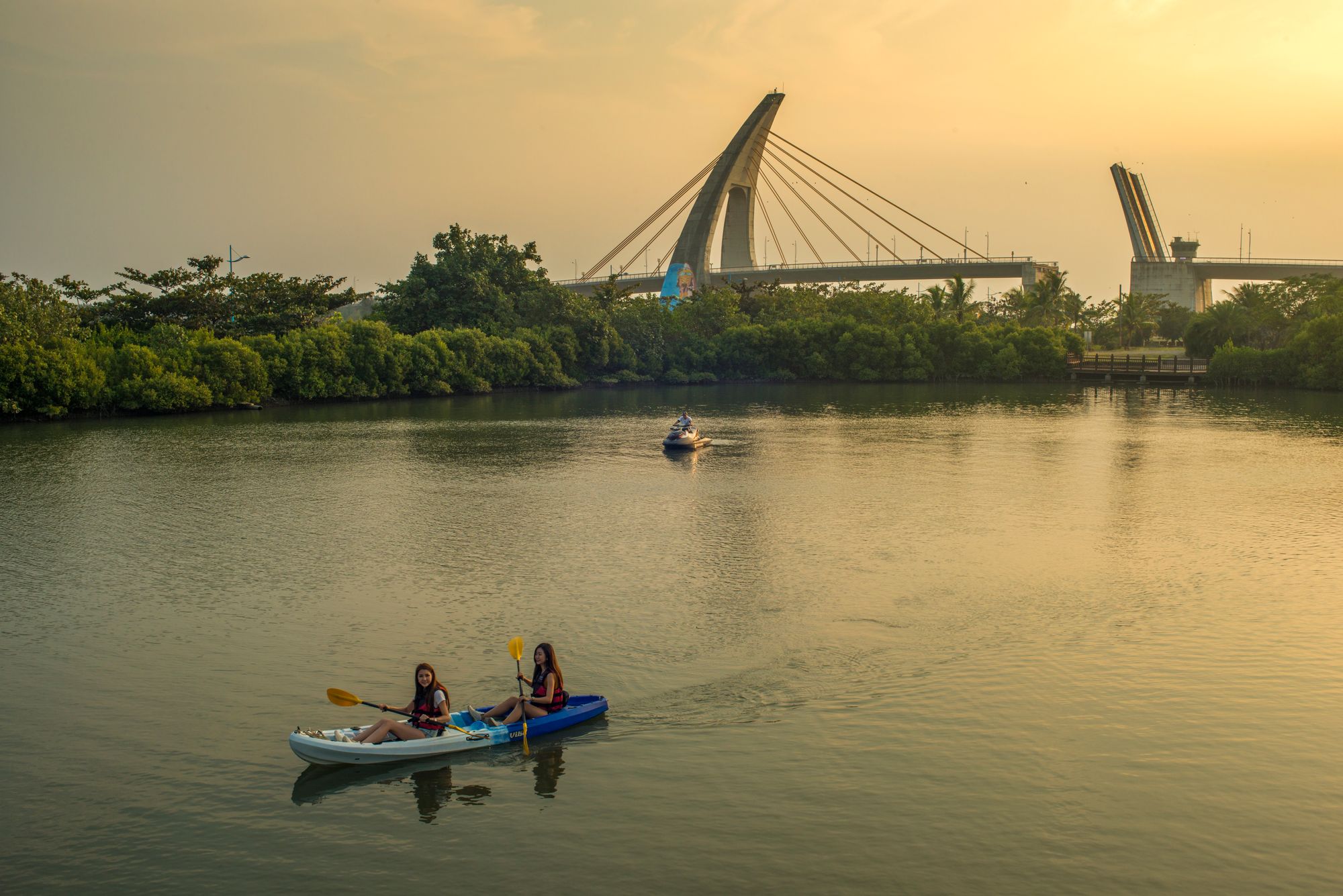 全台唯一可配合船舶进出港口升降的开启式景观桥,夜间还有一天一颜色光雕秀,是东港的打卡圣地!