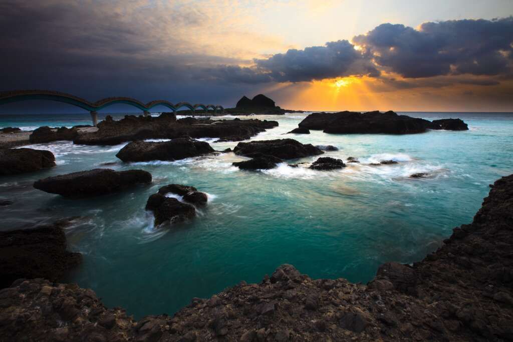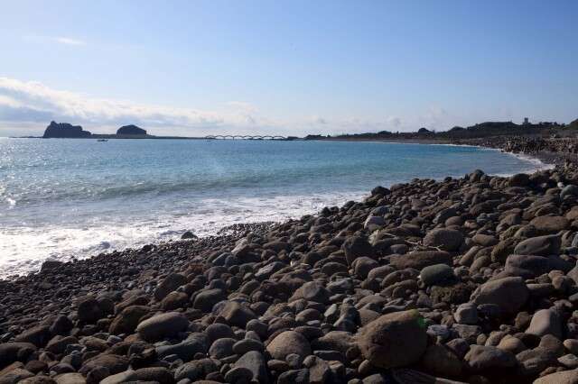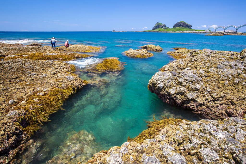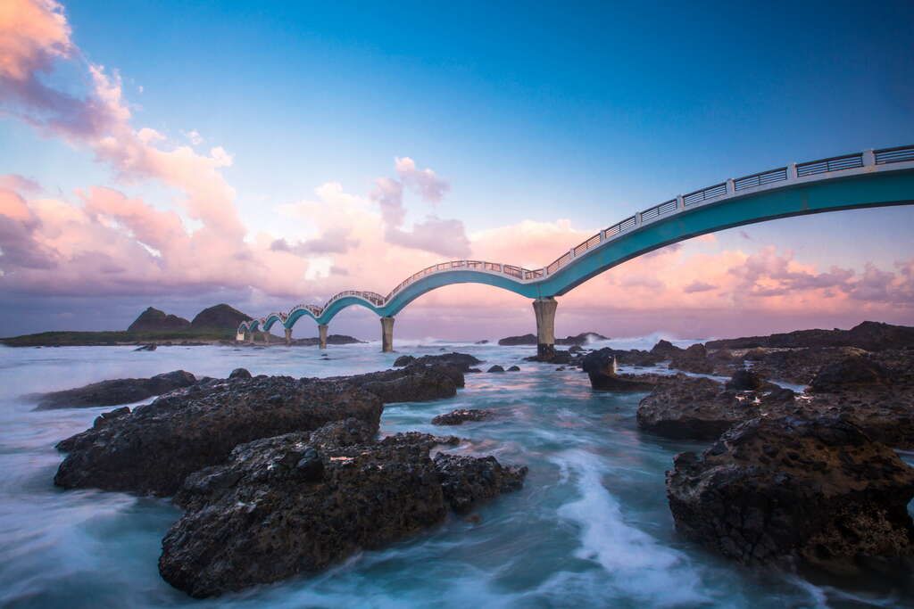 三仙台跨海步桥,长度近400公尺,共有八个拱桥连接而成,红灰色的桥身横卧,串起了陆地与岬角海湾,状似长龙卧波,是三仙台最具指标性的景观。