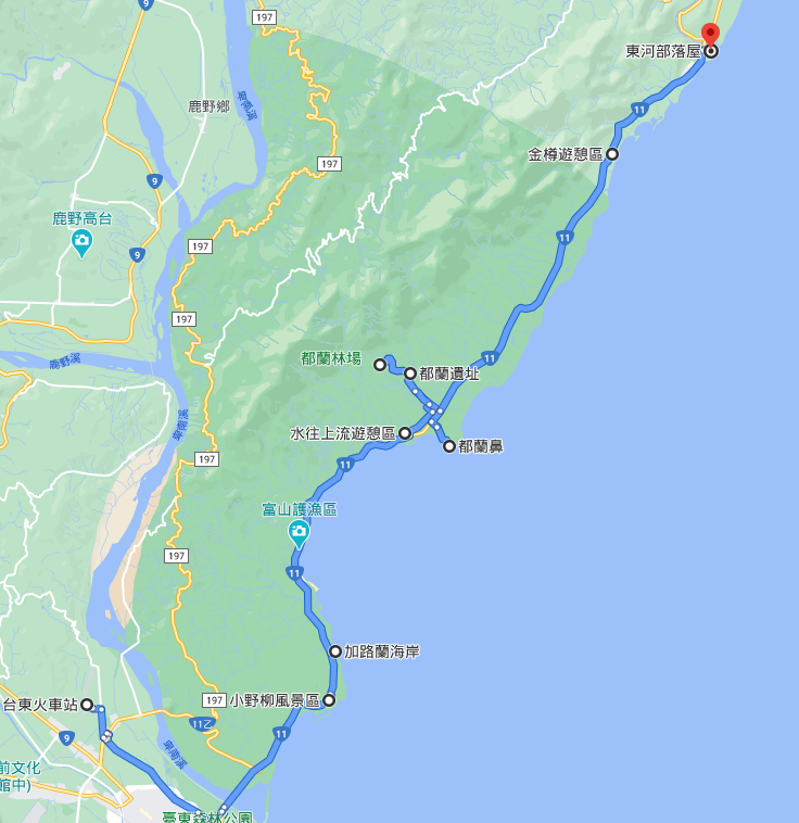 台东火车站→小野柳风景区→加路兰海岸→水往上流游憩区→都兰遗址→月光小栈→都兰鼻→金樽游憩区→东河部落屋(50公里左右)