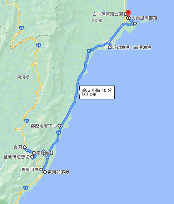 东河部落屋→东河桥→泰源→登仙桥→泰源幽谷→都历→成功渔港→三仙台→白守莲河滨公园→比西里岸部落(40公里左右)