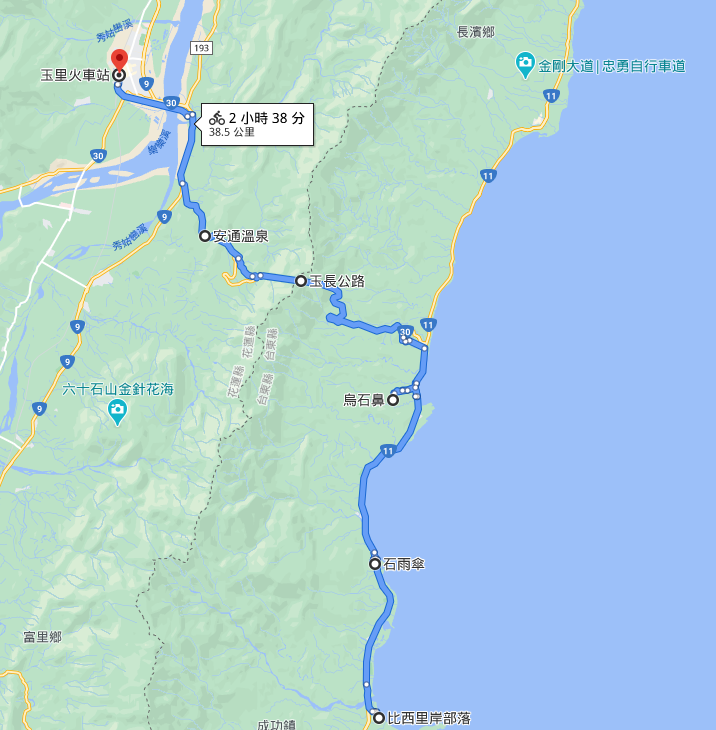 比西里岸部落→石雨伞→乌石鼻→玉长公路→安通温泉→玉里(40公里左右)
