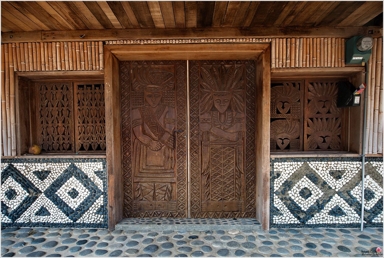 水琏部落搭铁牛车巡礼,来到部落教室,门窗有精致木雕,外墙以水琏海边的黑石、白石粘铺墙面,很有特色。