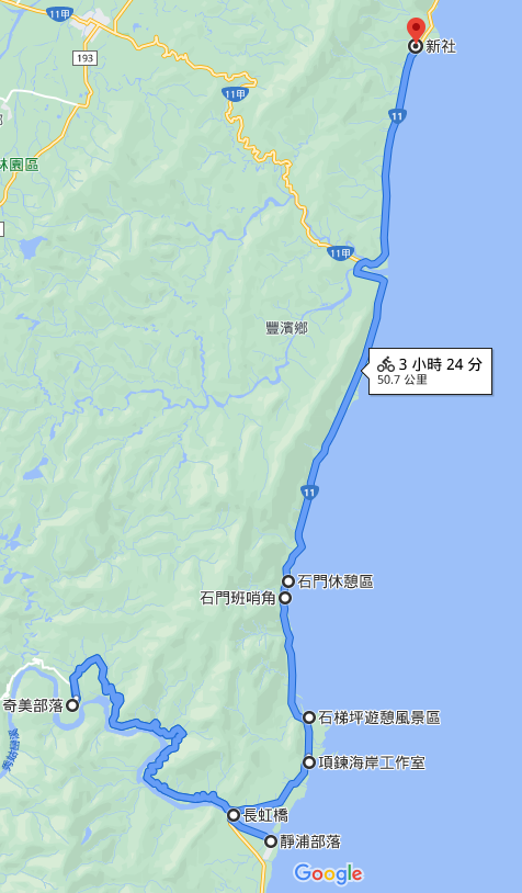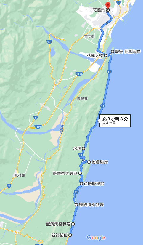 新社→丰滨天空步道→矶崎海水浴场→芭崎瞭望台→水琏部落→盐寮→花莲大桥→花莲火车站(52公里)