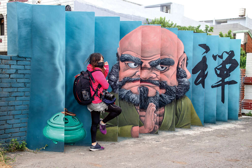 全台独创「双面画」,11座墙以45度角立放,站在左边看过去是威严的达摩,慢慢走到右边转换成开心的弥勒佛(图片来自云嘉南滨海风景区管理处)