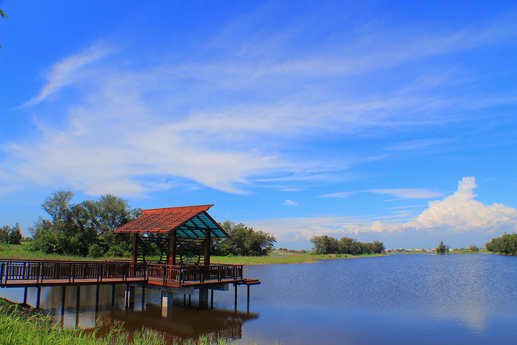 境内可欣赏到各式各样的湿地景观,包括有舄湖、沙洲地、渔塭及木麻黄林所组成的生态空间,为此吸引了大批的水鸟的进驻,其实要欣赏水鸟的姿态,堤防旁的杂树林就可以瞧见水鸟踪迹,包括白鹭鸶、大卷尾、绿绣眼、夜鹭等常常在树梢枝头上流连忘返,安静的聆听,更会发现这里简直是水鸟们办Party的场所,一声接着一声,好不热闹。