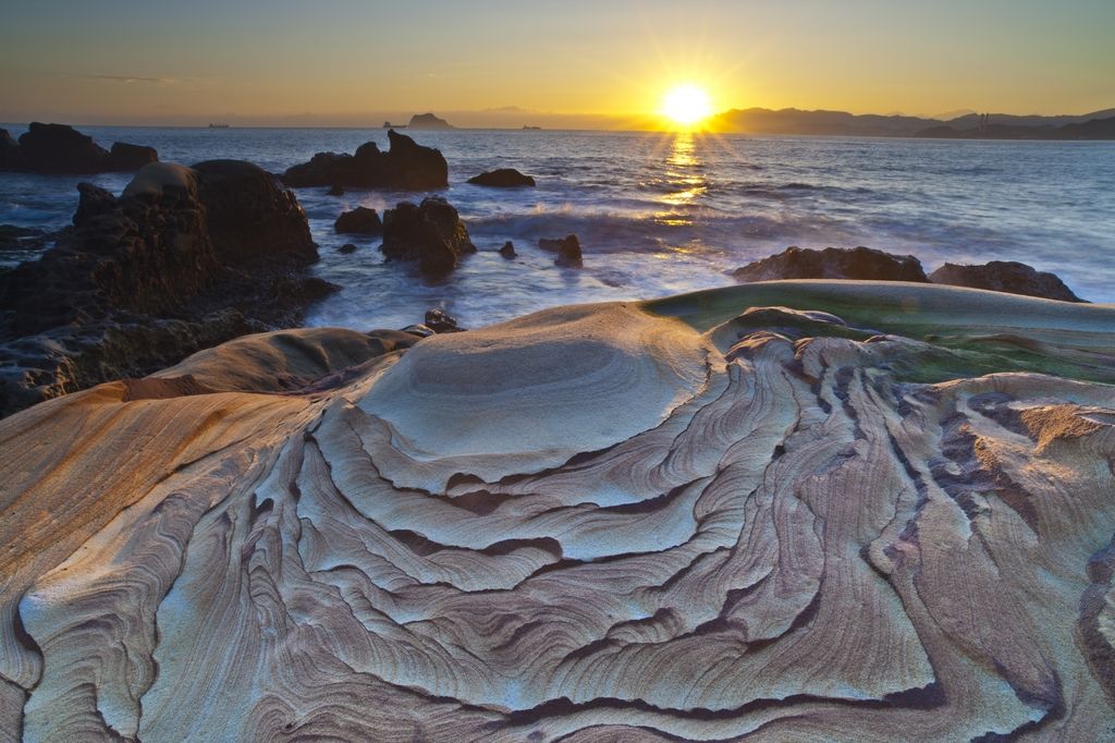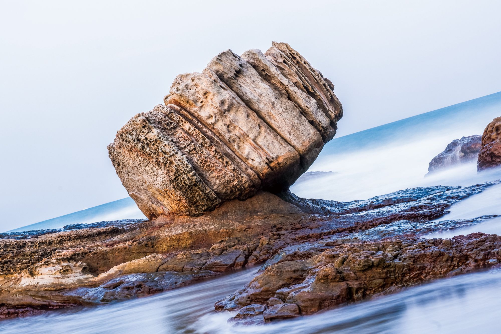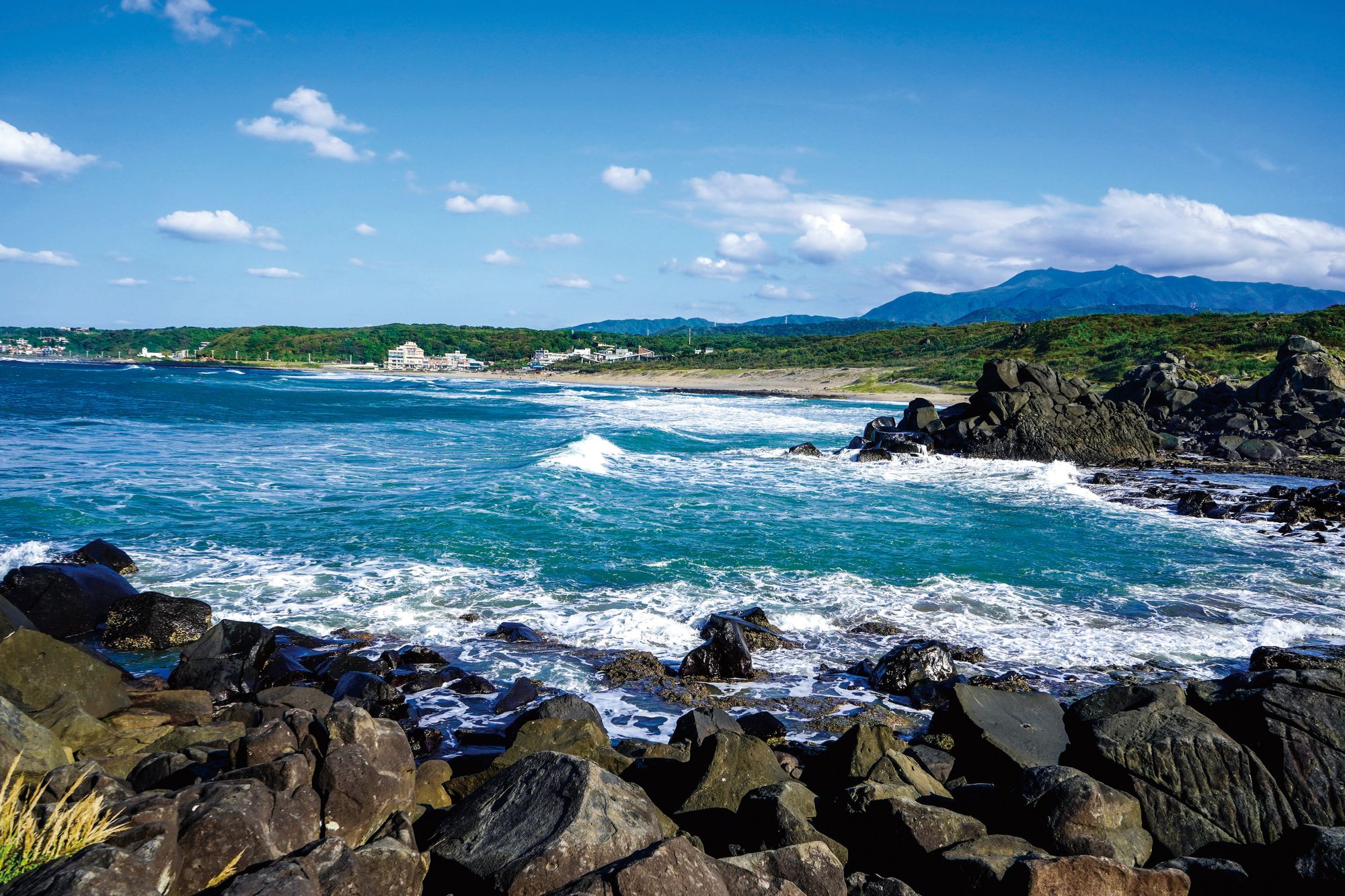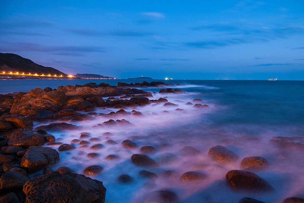 行至渔港旁的富贵角,可循着环状道路绕行岬角一圈,途经能体验风筝DIY的风艺术营区、八角型结构的富贵角灯塔,而步道沿途的植物生态与地景景观也值得细细欣赏。走入滨海木栈道,则可直接抵达沙滩,若是每年3至5月来访,还能看到梦幻的绿石槽景观,是这片沙滩上最美丽的季节风情画。