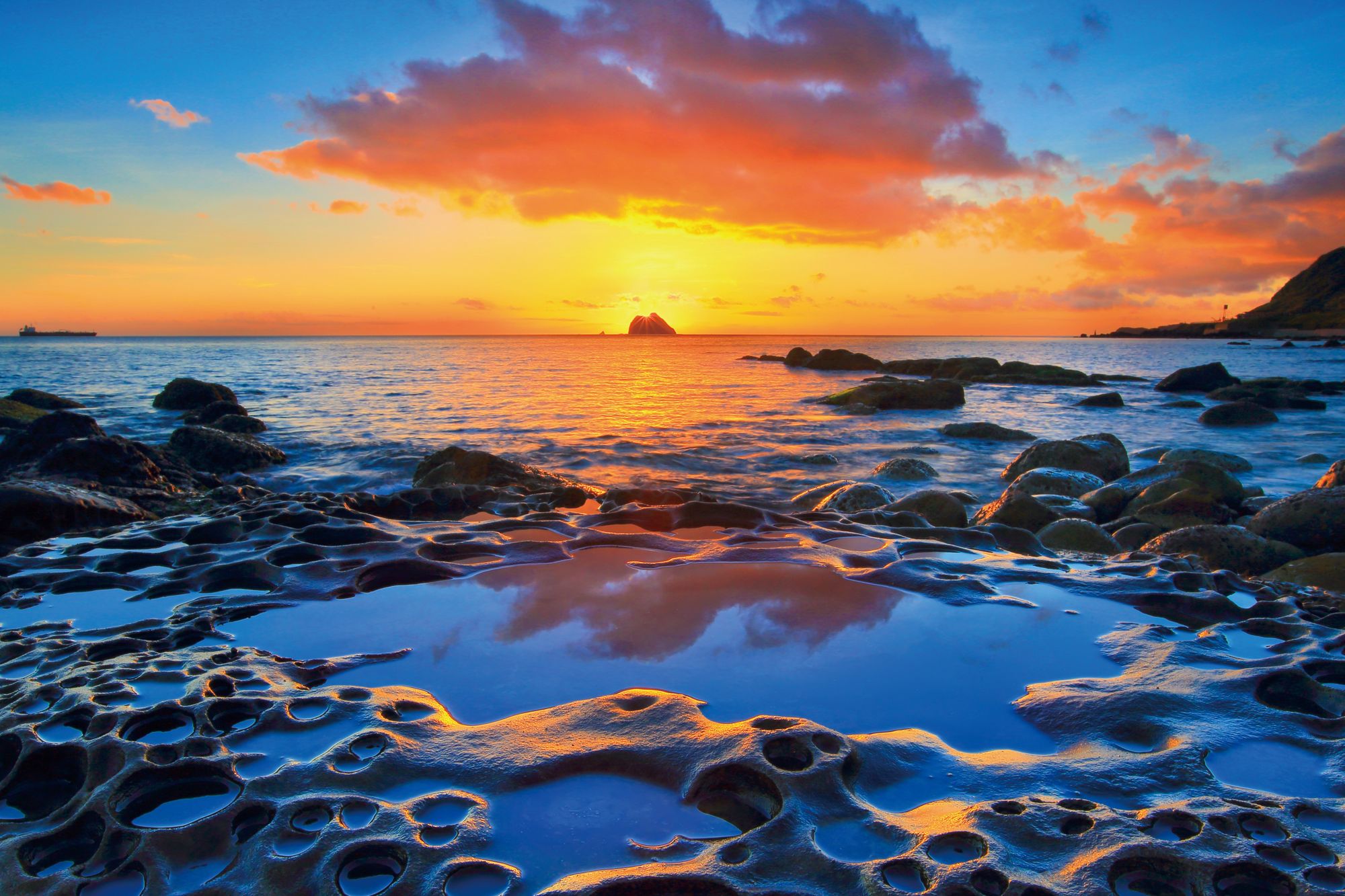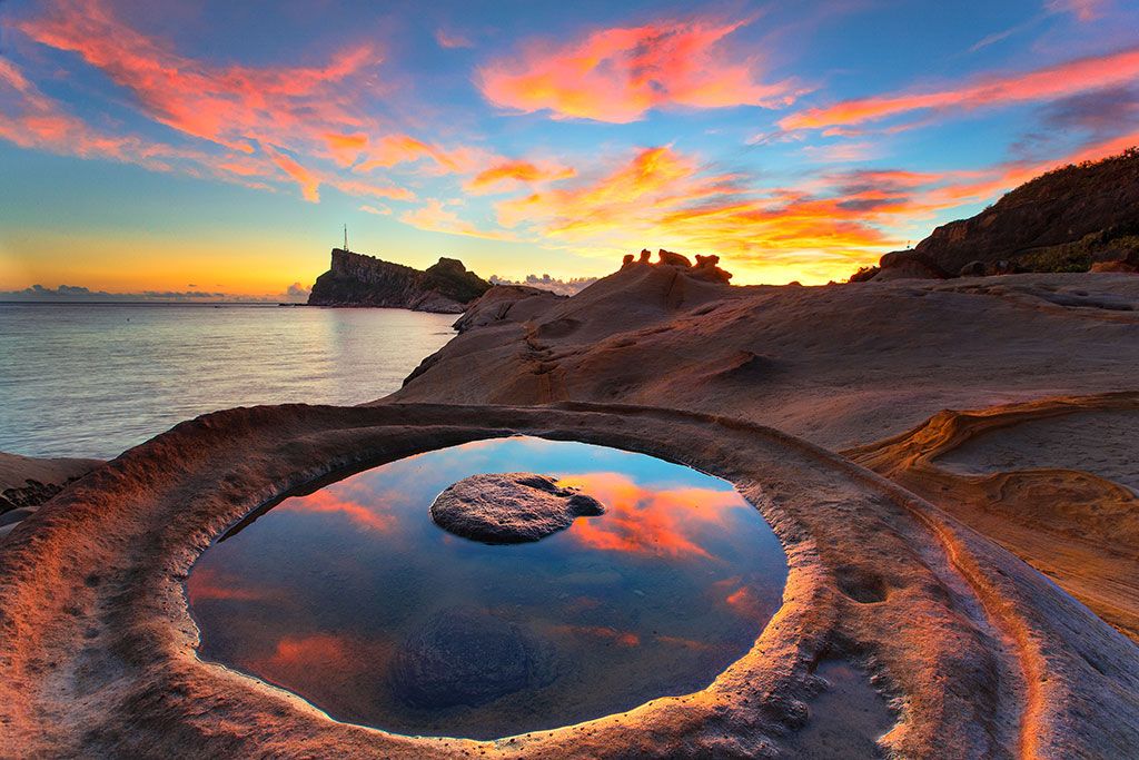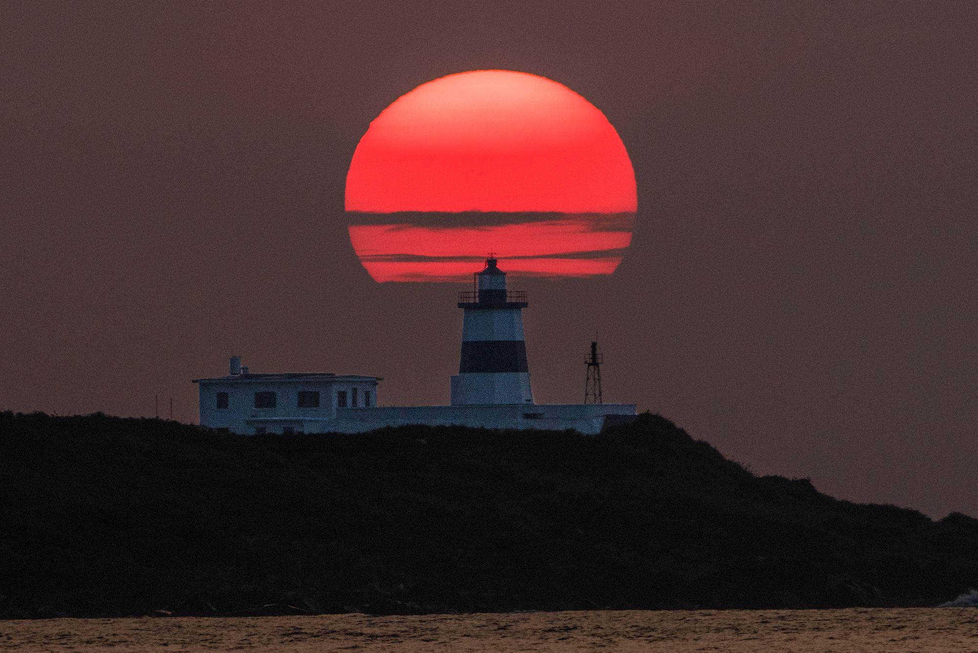 富贵角灯塔为拍摄「悬日美景」的著名地标,当太阳缓缓落下,火红悬日正好落在灯塔中间,橘黄色光线照亮天际,形成难得一见,期间限定的「灯塔悬日」奇景。(图片来自北海岸及观音山风景区管理处-摄影师张隆)