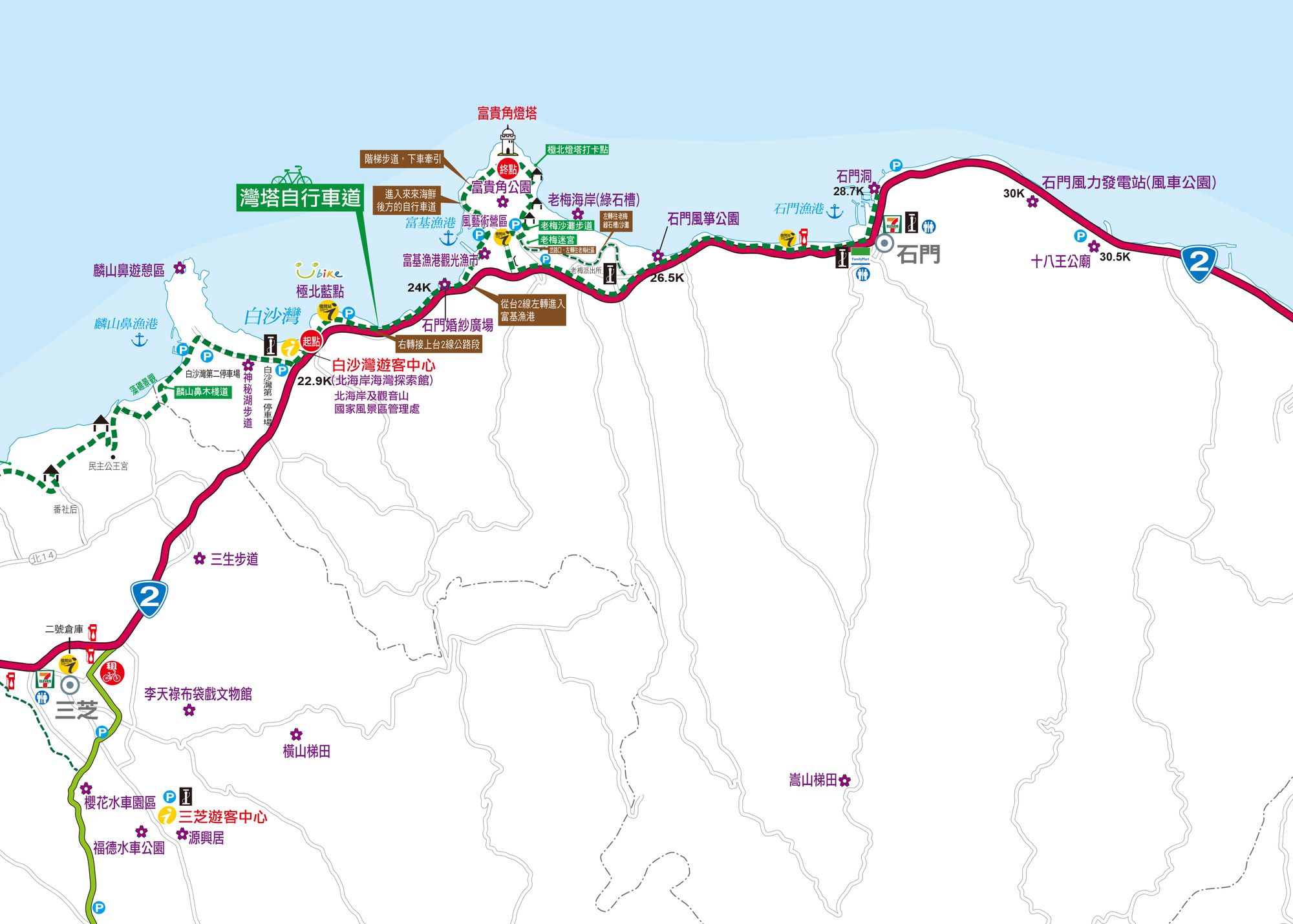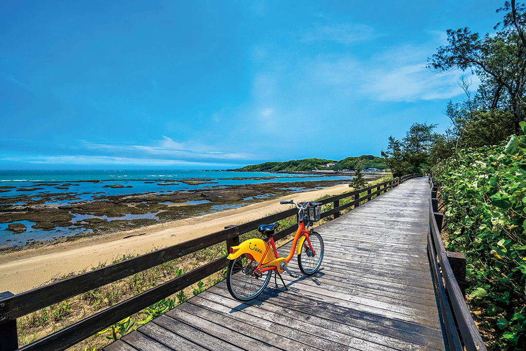 自行车道以整体连贯的设计开发使得北海岸滨海路线连成一气,沿途可欣赏沙滩风光、藻礁潮间带、风棱石及植物生态,来一趟风芝门之旅。