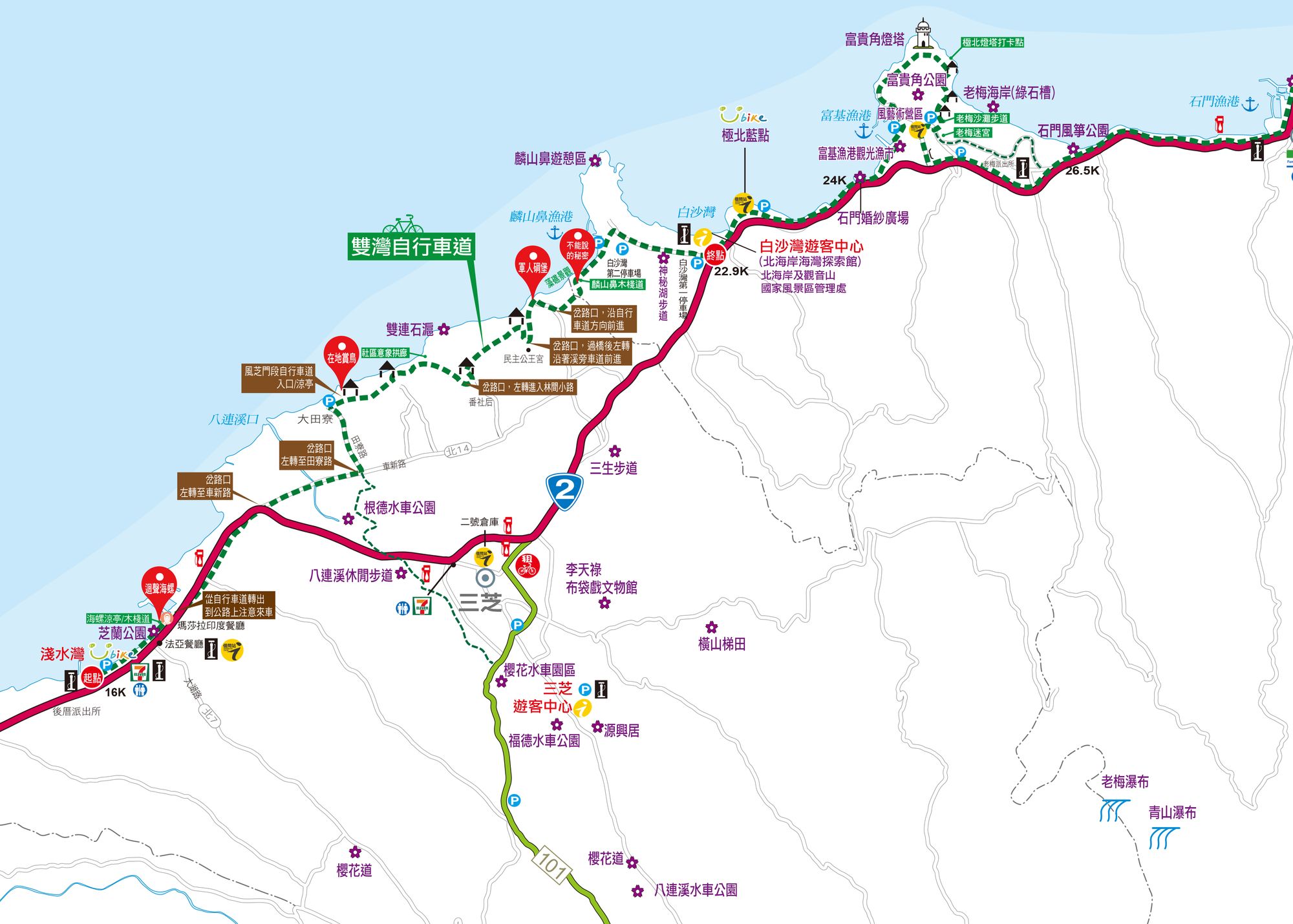 双湾自行车道为一座以浅水湾为起点,长达8公里,沿滨海而建的木栈车道。车道一路从浅水湾向白沙湾延伸,游客可以一路从石门畅游至三芝,沿途可饱览北海岸众多观光景点包含浅水湾沙滩风光、藻礁潮间带、风棱石、庙宇及麟山鼻等自然生态,一边骑乘一边畅游滨海风光;终点为位于麟山鼻与富贵角两处海岬之间的白沙湾,此地拥有绵延一公里的半月形洁白贝壳沙滩,海边景致旖旎且为夏日戏水胜地,非常适合游客休息游憩。