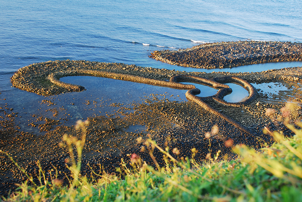 往北沿着滨海道路走经过分叉仔、牛母坪、小台湾,就来到双心石沪。石沪是澎湖独特的人文景观,也是澎湖先民智慧的结晶,双心石沪为由两个石沪搭成的心型,从高处向下俯瞰,头尾相接,形成两个爱心相连的浪漫景象,是澎湖地区众多石沪中保留最完整的石沪之一。