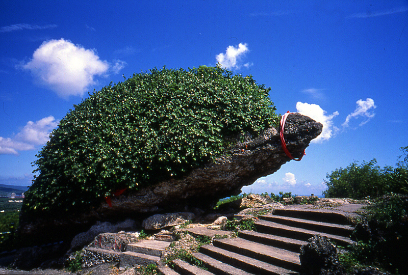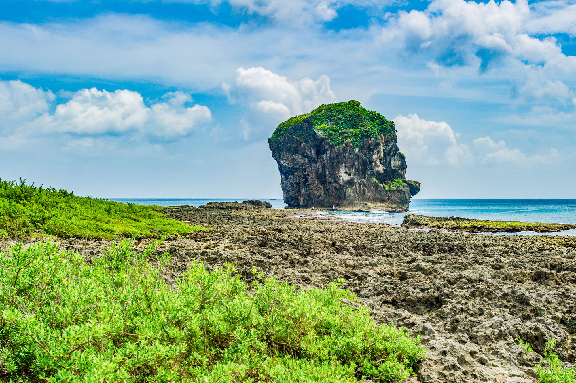 疑似伪装的野战巨型钢盔之巨大礁岩,以前民间未知其来处,故称为「飞来石」;从其组成及四周地形可知为隆起珊瑚礁经差异侵蚀而遗留。(图片来自旅游服务中心)