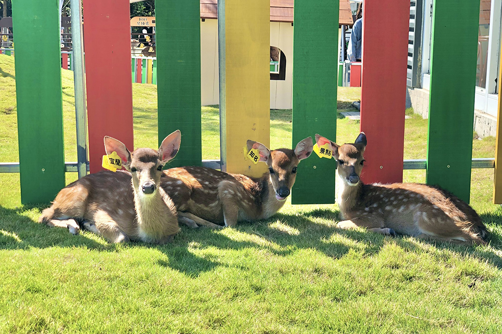 - 休闲农场里鹿平均体型较大,当中3只最有特色的小鹿斑比,是鹿耳上分多挂上”宜兰””知名””景点”6个字,超级有特色!!