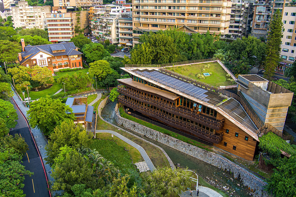 屋顶为轻质生态屋顶,设有太阳能光电板发电,可发电16千瓦电力,并采大量阳台深遮阳及垂直木格栅,减少热辐射进入室内,降低耗能达到节能效果。绿化屋顶及斜坡草坡设计可涵养水分自然排水至雨水回收槽,再利用回收水浇灌植栽及冲水马桶,达到绿化与减低水资源浪费。