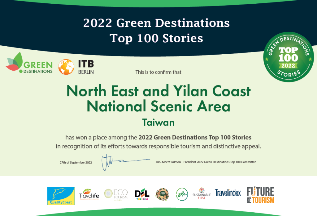 东北角暨宜兰海岸风景区管理处(东北角管理处)自2016年开始以GSTC全球永续旅游准则为指南,并依循绿色旅游目的地100项准则为操作目标,与全世界各国绿色旅游目的地在永续的道路上持续交流、前进,更于于2020年12月29日通过荷兰绿色旅游目的地基金会双稽核员检核,取得「绿色旅游目的地金奖认证」,也是东亚第一个取得「绿色旅游目的地金奖认证」(Green Destinations Gold Award) 之旅游目的地。