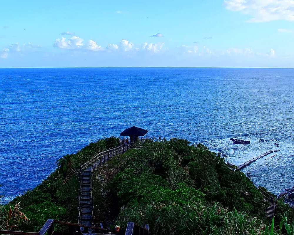 由朝日温泉旁的小径走进去,沿步道而上,就来到有「绿岛地毯」之称的帆船鼻草原。帆船鼻位于绿岛东南角,平坦的海岬台地上绿草如茵,与四周的蓝天碧海,构成看不到绿意与蓝色尽头的极佳的景致,草原边缘悬崖可以俯视朝日温泉与海参坪,也是绿岛居高临下欣赏日出、月升、星海,沐浴海风的最佳景点之一。