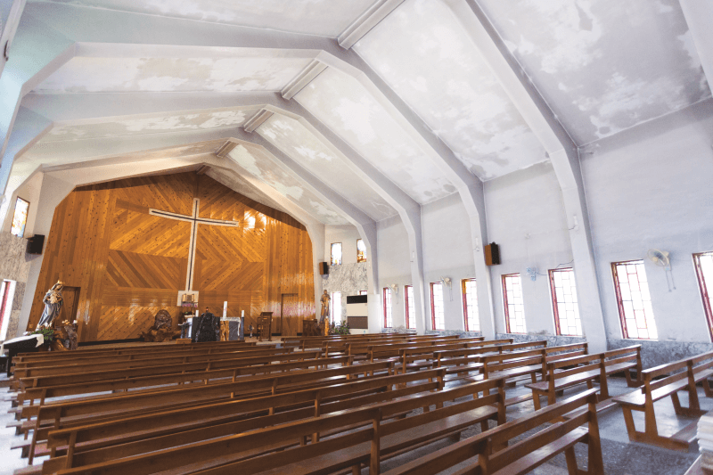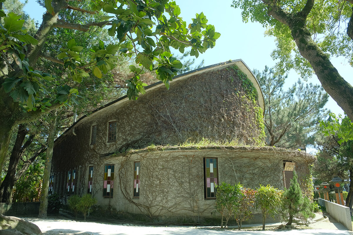 1956年新城天主堂落成在新城神社原址,诺亚方舟的造型有著新生再造的意义,天主堂洗石子的墙面爬满了青绿色的藤蔓,内部庄严洁净,两侧窗户镶嵌彩绘玻璃,后有圣洗池及告解区。
