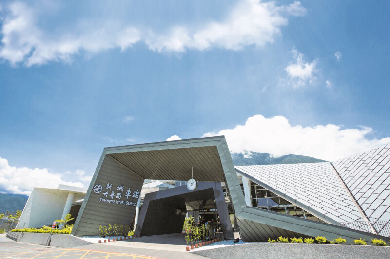 坐落太鲁阁公园入口的新城 (太鲁阁) 车站,其崭新建筑之站体就如同一件艺术品,以「门」的意象形塑车站,参采隐喻立雾溪切割太鲁阁峡谷,呈现 V 形的立面,展现花东第一门面之气势与独特迎宾视觉的意象,另书法家朱振南老师为车站站名题字更增添文化气息,使交通与人文艺术有美丽邂逅。
