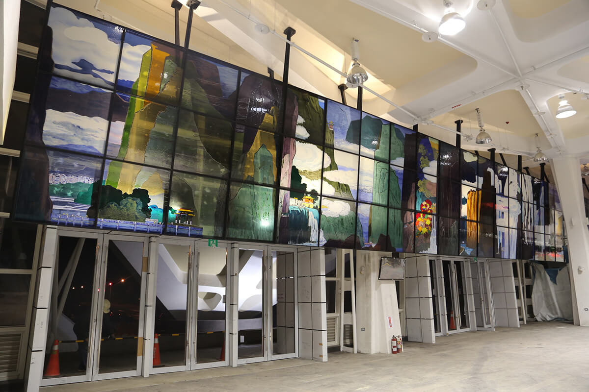 已故水墨画家-马白水教授【太鲁阁之美】画作用窑烧玻璃之技法翻制于本车站中,由花莲在地艺术家陈彦君老师所烧制,配合灯光展演将台湾地景,借由驿站大门推荐给全世界 (Photo via Wikimedia, by 交通部铁路改建工程局东部工程处, CC BY-SA 4.0)