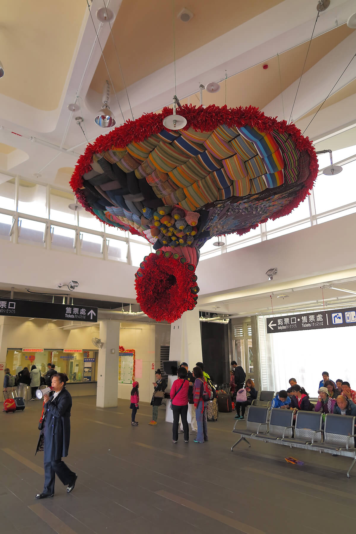 编织艺术家林介文小姐(太鲁阁族)所设计之作品【织路】,艺术家带领著32位原住民的织女进行编织创作,透过大量的民众参与活动,让织布艺术找到生命,得以延续,作品以色彩缤纷原住民传统织布包覆著钢骨结构,由天花板垂吊呈喇叭状开口,欢迎著在此进出的旅客。 (Photo via Wikimedia, by 交通部铁路改建工程局东部工程处, CC BY-SA 4.0)