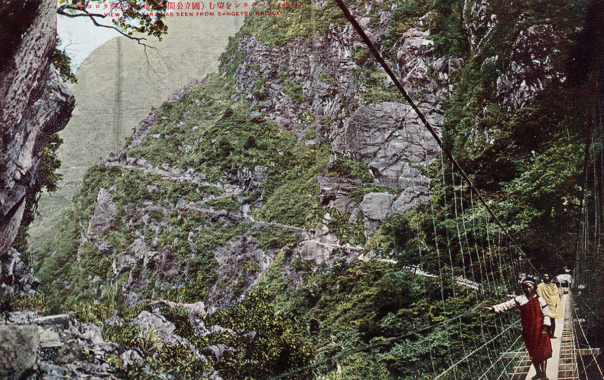 这是自山月桥向巴达冈望去的景色。图片中可见一位身穿传统部落服装的太鲁阁族妇女站在吊桥上,而她后方的锥麓断崖上,那条沿著山壁的羊肠小径就是现在著名的「锥麓古道」。巴达冈在太鲁阁语有「麻竹」的意思,亦有「突袭战地」之意,可见此地除了有民俗植物的栽种也有地势上的战略价值。值得一提的是,图中的色彩并不是原本相片拥有的颜色,而是后制而成的,因为彩色相片在当时相当昂贵也不好取得,所以当时流行一种人工上色的技巧,将原本只有黑白的照片用水彩或色笔一点一点上色,从图片上看,画师的笔工是非常精致细腻的,颜色还原度相当的好,让我们能更接近当年巴达冈的风光。创作者:花莲县文化局。建档单位:花莲县文化局。数位物件授权:CC BY 李昕颖。发布于《文化记忆库》