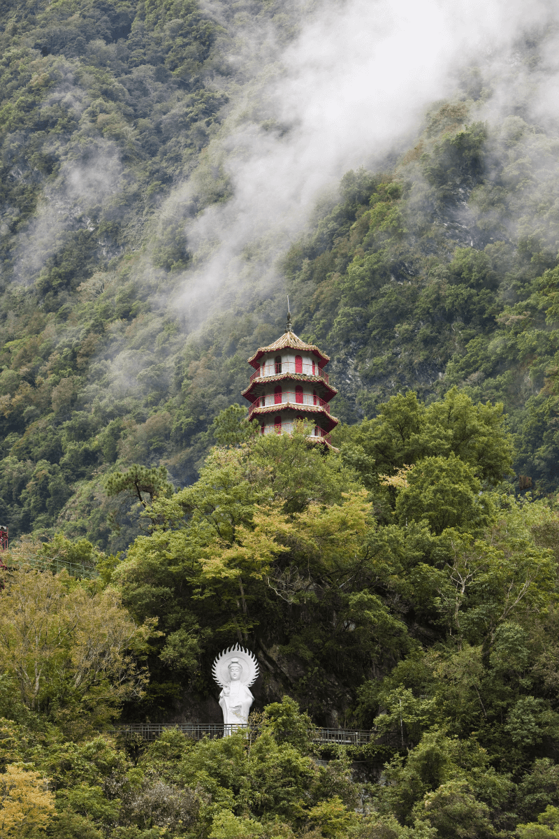 走过普渡桥,沿祥德寺步道行走,有二十六台尺高的白衣观音像、七层高的天峰塔,有庄严的地藏菩萨像,和宏伟的大雄宝殿,可以感染清思佛理的气息,若您求的是与山林对话,或蛰伏、或穿梭阔叶林带的鸣虫、飞鸟、舞蝶,也绝不让妳败兴而归,幸运的话,还有太鲁阁大戟及太鲁阁栎两种稀有植物来相会。