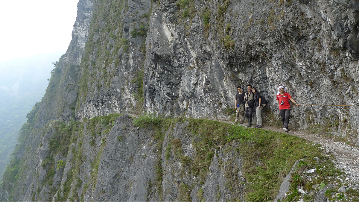 锥麓大断崖是立雾溪切穿三角锥山棱线而形成的,此一垂直陡立的峭壁,长约 1.2 公里,高约 600 公尺,步道宽约 1.5 公尺,靠岩壁的一侧有绳索,另一侧的断崖垂直抵达立雾溪谷。建档单位:原住民族委员会原住民族文化发展中心。数位物件授权:CC BY 杨飞容。发布于《文化记忆库》