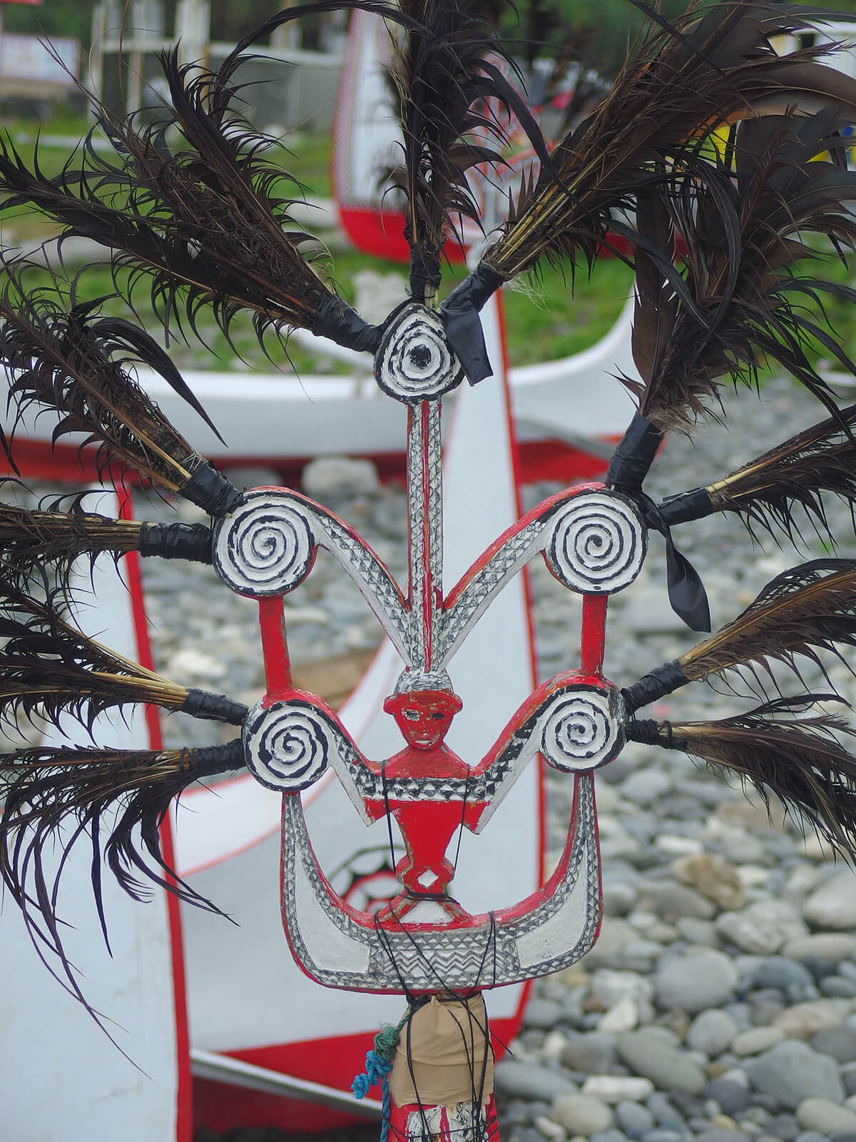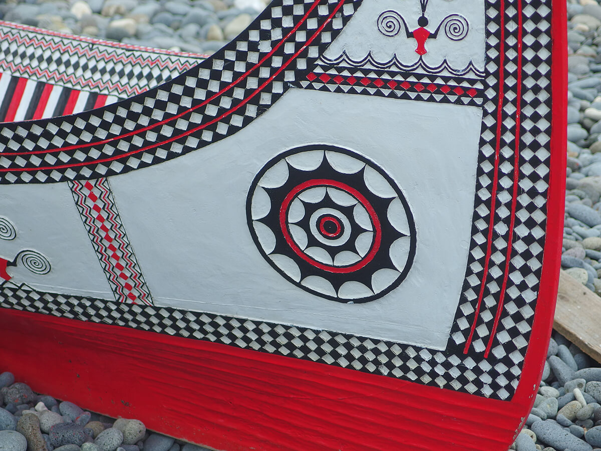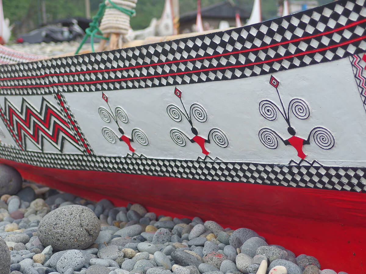 船舟上的色彩以红、黑、白三色为主,雕刻常见的图案有同心圆纹、人形纹、波浪纹、十字纹等。凹的部分涂白,凸的部分涂黑,没于水中的四块船板则是著上朱色。(Photo via "GiBBYLi" © tatala no tao @ flickr, CC BY-NC-ND 2.0)