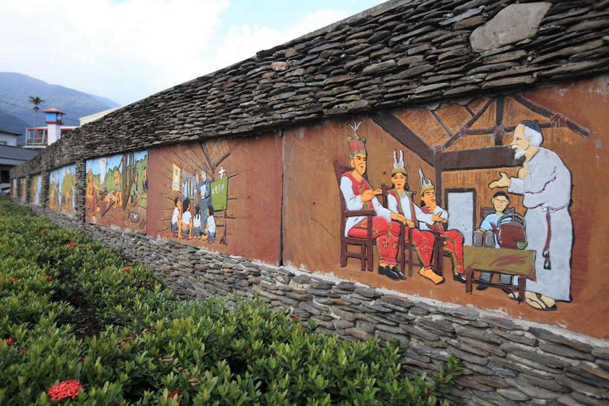 知本天主堂外围石墙上的图绘-知本卑南族的源起与早期神话传说(Photo via "鹏智 Bird 赖 Lai" © 台东市知本卡地布部落-知本天主堂-卑南族神话彩绘-7-20080911-赖鹏智摄 @ flickr, CC BY-NC-ND 2.0