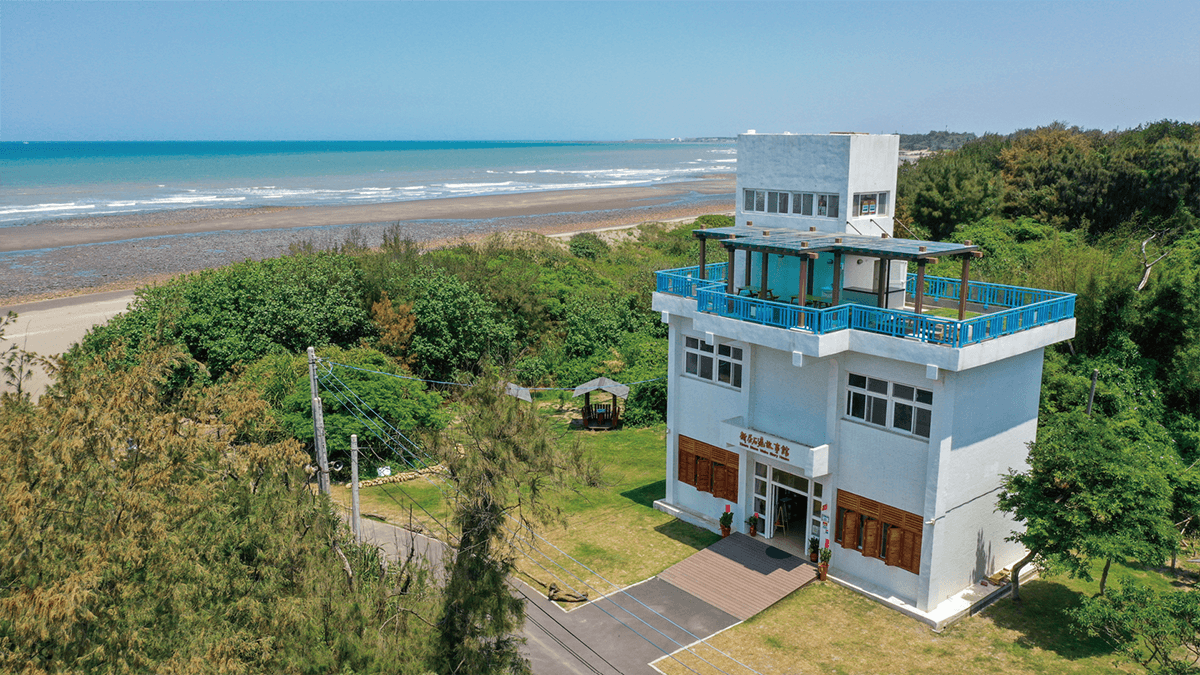 这座白色建筑物,原是员警宿舍(蚵一哨所),于2021年3月以崭新的面貌重生为「新屋石沪故事馆」。馆内展示了丰富的渔业文物,并通过游戏APP讲述人与石沪的互动发展历史。与地方社区发展协会合作管理,馆内结合净滩废弃物及石沪意象,让参访者化身为海创客,亲手制作手工艺品。在这寓教于乐的氛围中,新屋百年文化得以薪火相传。