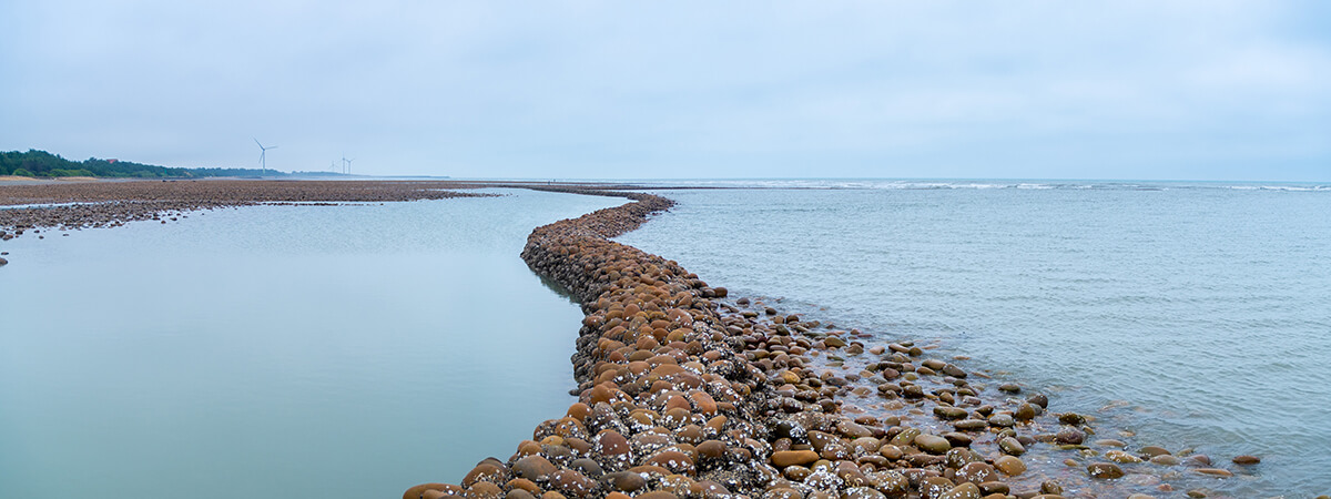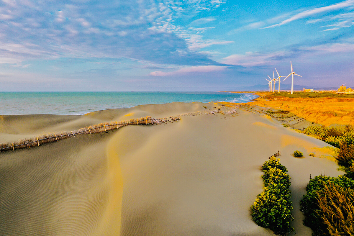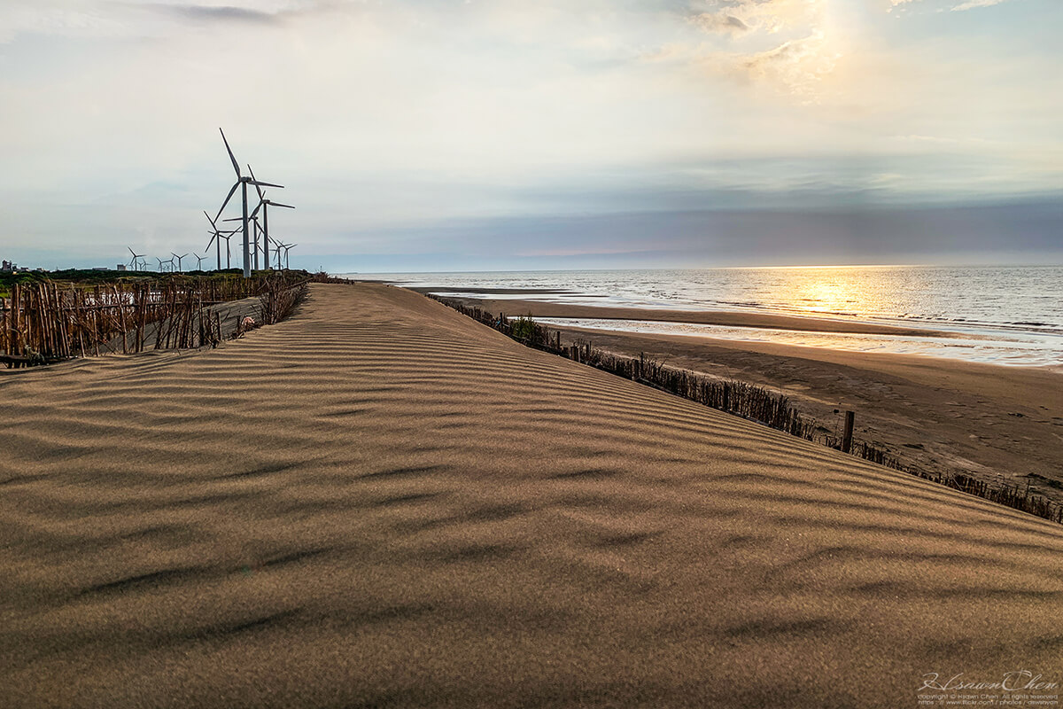延绵 8.1 公里的「沿海沙漠」,每当夕阳西下,成排的发电风车静静伫立,沙岸与海天连成一线。起伏的沙丘上,蜿蜒的沙纹与交错的脚印,共同谱写出一种寂静而苍凉的美感。这里吸引了无数摄影达人和网红前来拍摄,电影《不能说的秘密》和电视剧《波丽士大人》也曾在此取景,为这片大自然的画布增添了无数光影的故事。
