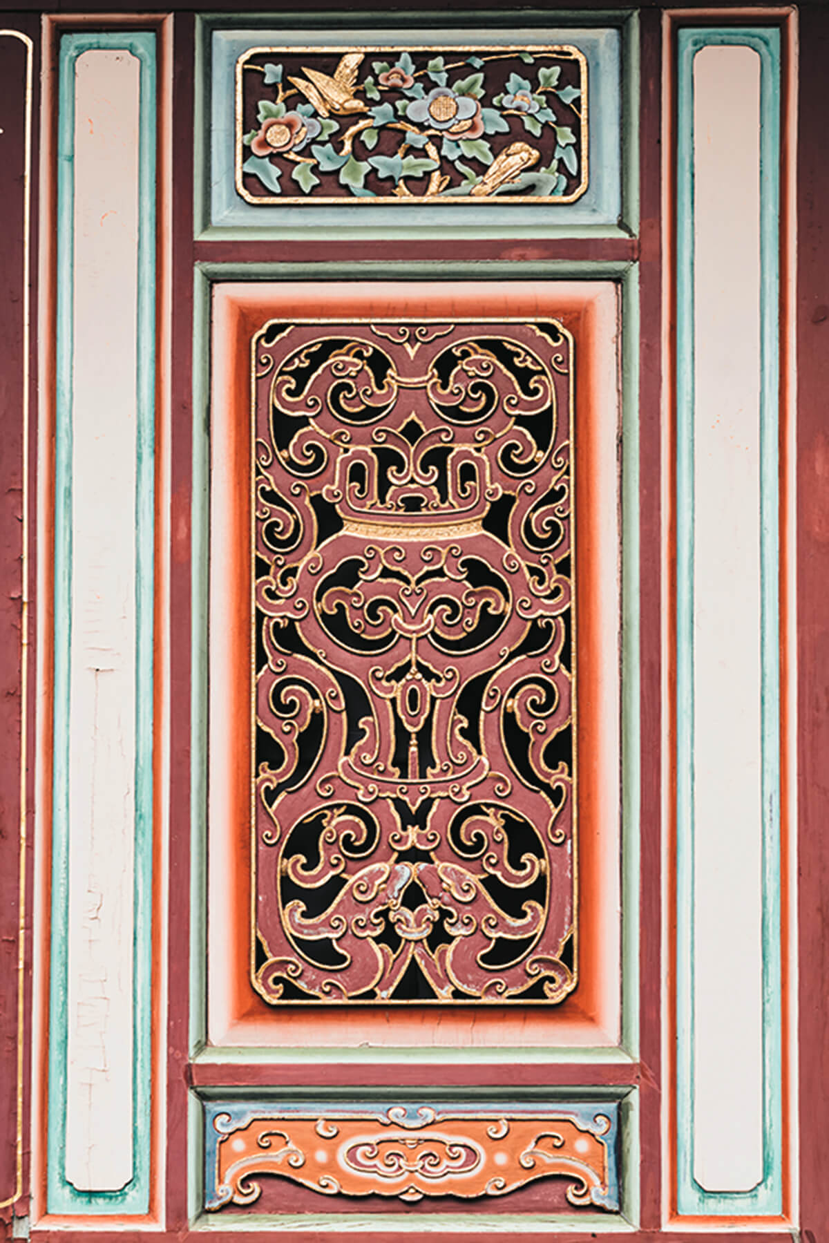 正门两侧雕刻精致的「螭虎团炉」图案。