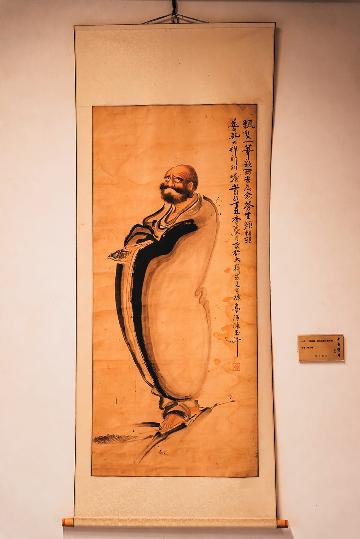 因香火鼎盛, 早年行脚途经此地的骚人墨客未曾间断,寄居寺中一年半载,离去时多会留下墨宝餽赠,若用当代流行语一言以蔽之,约莫就是「打工换宿」的概念。斋明寺中除了古迹处处外,许多珍贵的水墨、字画,颇具看头。如一幅〈达摩图〉,上题「飘然一苇欲西去,为念苍生频转头」,出自台南的建筑彩绘匠师陈玉峰之手, 达摩面露慈悲,不同于平常所见多是怒目金刚像,十分特别。