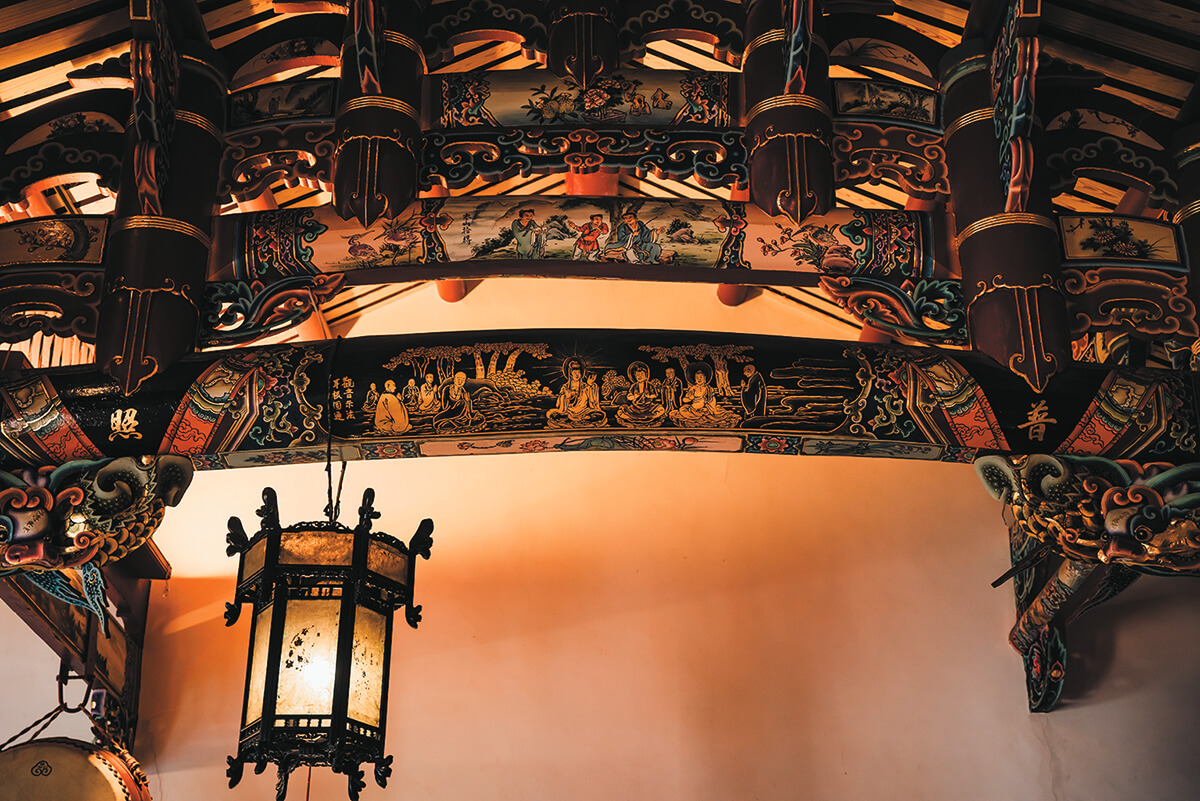 供桌上方横梁所绘的佛经故事,用的是黑底描金的技法,高贵典雅,是彩绘技术的极致表现。彭奕农解释,绘制过程中,须将金箔「擂」成细粉,涂擦在黑底上头,再勾勒出图案,因而被称为「擂金画」,原流行于广东一带,在台湾庙宇不算常见,也就显得格外珍贵。此外,「按金」、「描金」等传统庙宇的彩绘方式,在斋明寺也可看到。