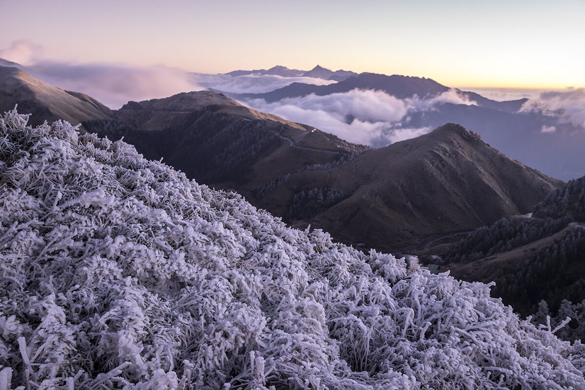 严冬的高山箭竹草原铺上一层雪白雾淞,搭配远景山头的云海日出,一片壮丽的山岳美景。(图片来自台旅会,陈渊清 摄)