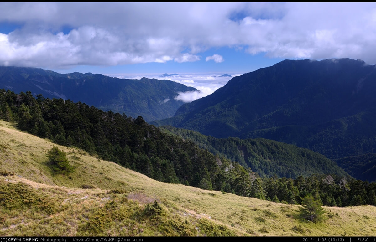 除了西侧有部分遮蔽外,站在武岭,四周壮丽山景尽收眼底。尤其东边的观景台,更是绝佳的眺望点,层峦叠嶂的奇莱山群和合欢山坡上绵延的箭竹草坡,构成一幅壮阔辽阔的风景画。