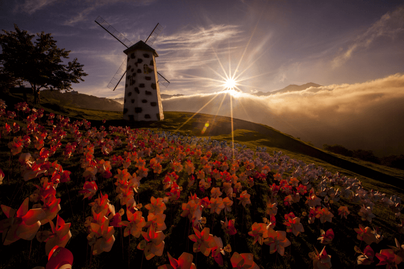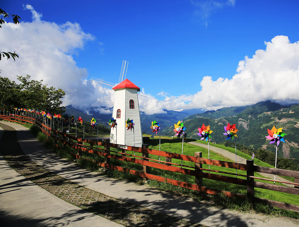 清境农场的牧区,在南侧高处设置了主题风车,搭配大型装置艺术和无数小风车,与起伏的草原融为一体,营造出梦幻的高山风车庄园。每年清境风车节,大大小小的风车为高山牧场增添可爱迷人的气息。游客漫步在草原风车小径,心情得到疗愈,风车也为清境注入新的活力。