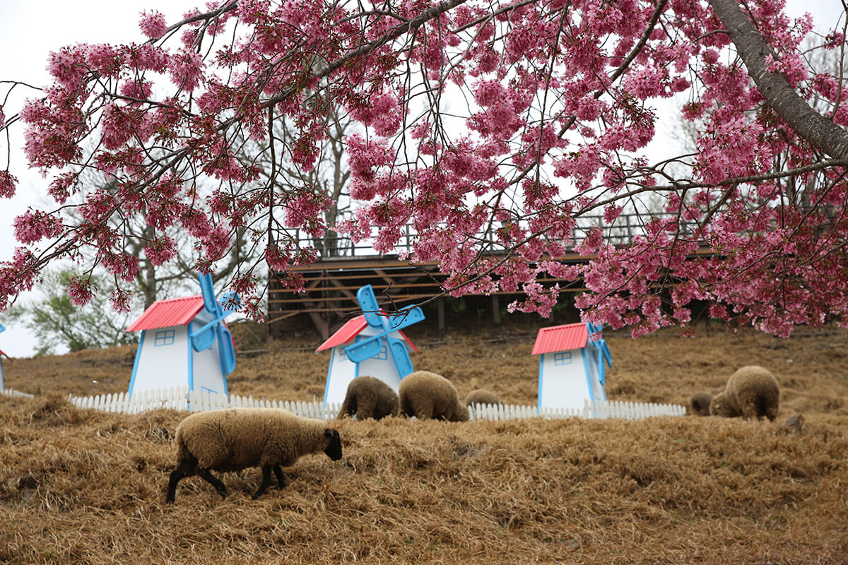 每年春季樱花绽放,与全台唯一的萨福克羊在草原上漫步 (图片来自退除役官兵辅导委员会清境农场)