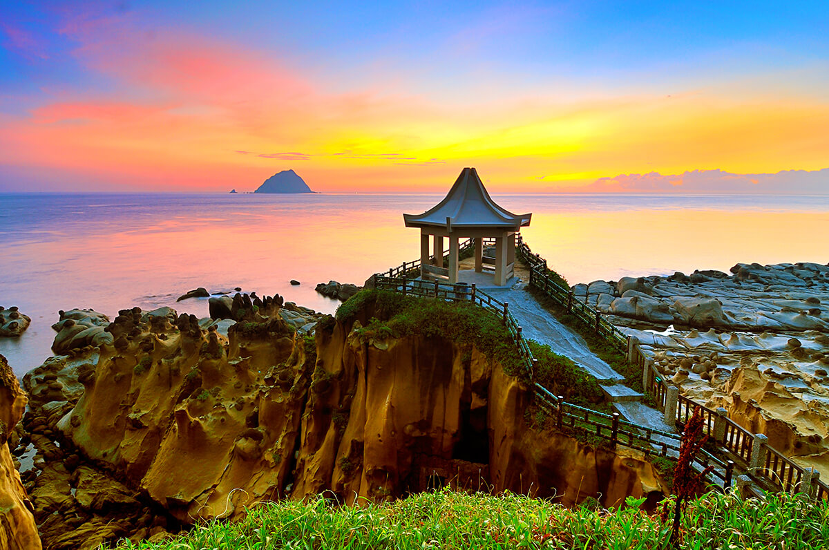 立于礁岩顶端的「等屿亭」与前方的基隆屿遥遥相望,亭下可见「千敷叠翠」的海蚀地景。(图片来自北海岸及观音山风景区管理处,唐荣国 摄)